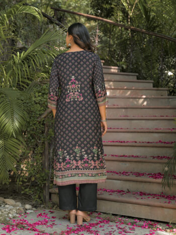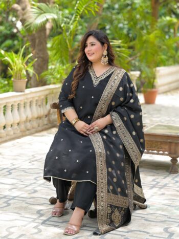 SKU: 9649B-BigLabel Khoj Women Roman Silk Embroidery Work Black Color Kurta & Bottom With Dupatta Set