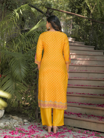 Label Khoj Women’s Mustard Chanderi Embroidered Kurta with Pant and Mustard Dupatta