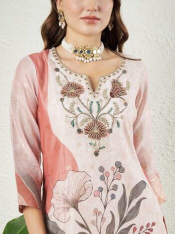 Label Khoj Women’s Peach Chanderi Embroidered Kurta with Pant and Peach Dupatta