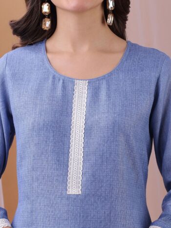 SKU: 10019Label Khoj Women’s Blue Linen Digital Printed With Stone Work Kurta with Pant and Blue Dupatta