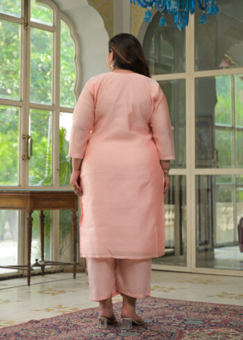 Label Khoj Women’s Peach Chanderi Embroidered Kurta with Pant and Peach Dupatta