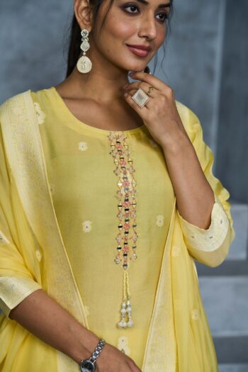 Label Khoj Women’s Mustard Chanderi Embroidered Kurta with Pant and Mustard Dupatta