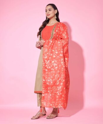 Label Khoj Women’s Peach Chanderi Embroidered Kurta with Pant and Peach Dupatta