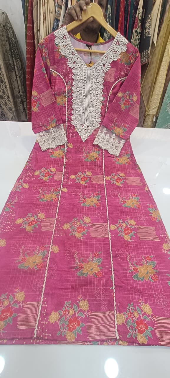 Label khoj linen printed kurti with Crochio neck work