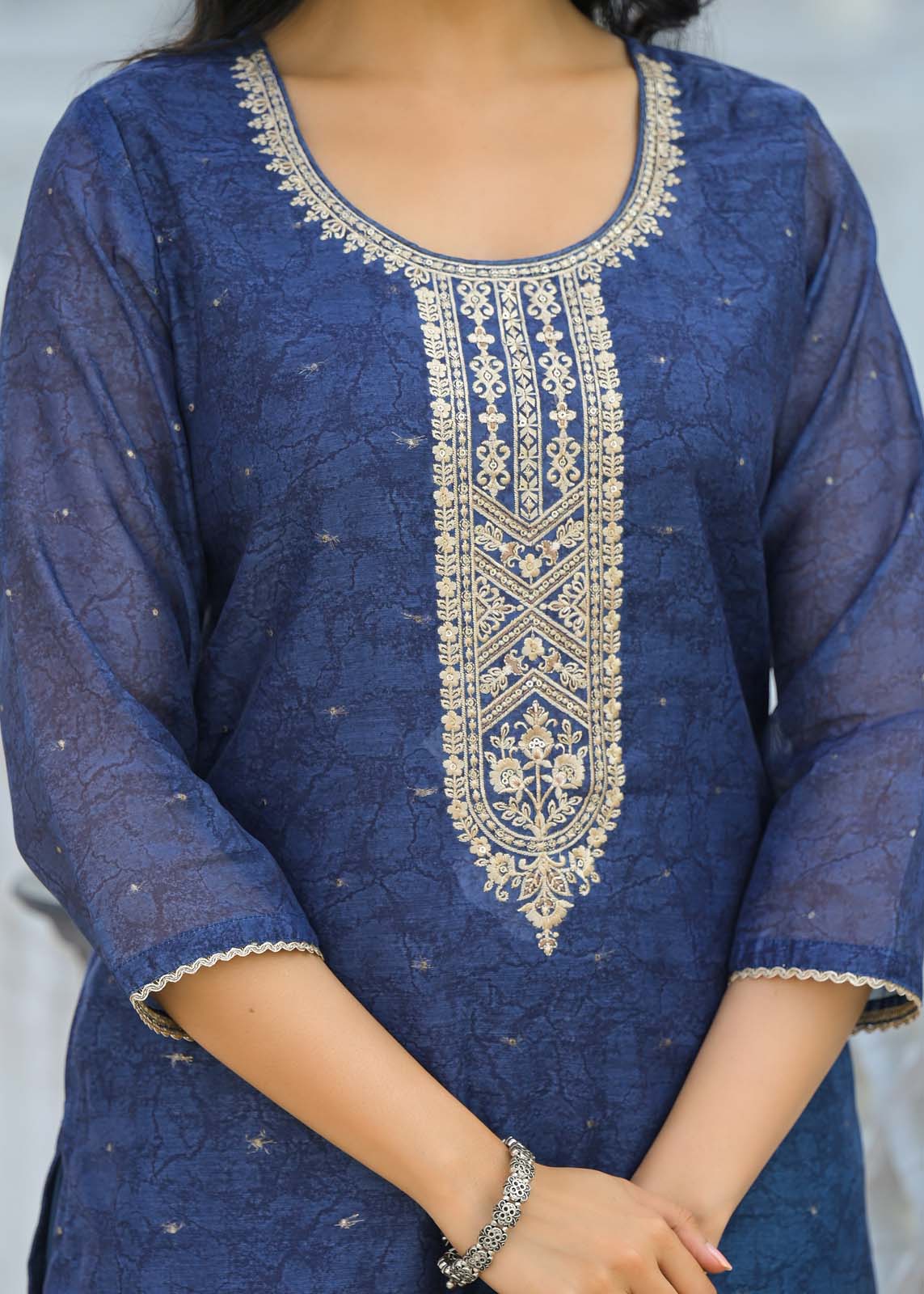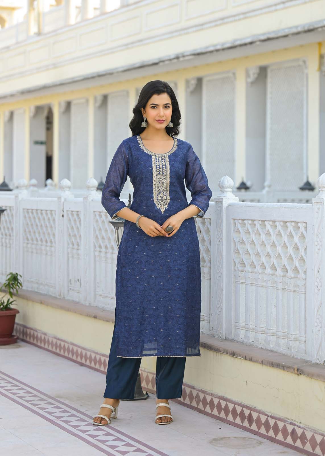 - Featuring intricate embroidery, 3/4th sleeves, and a round neck,