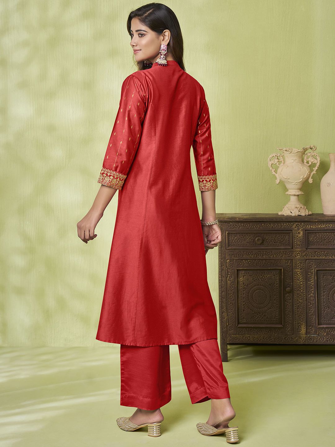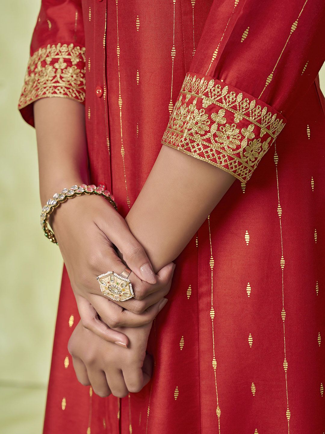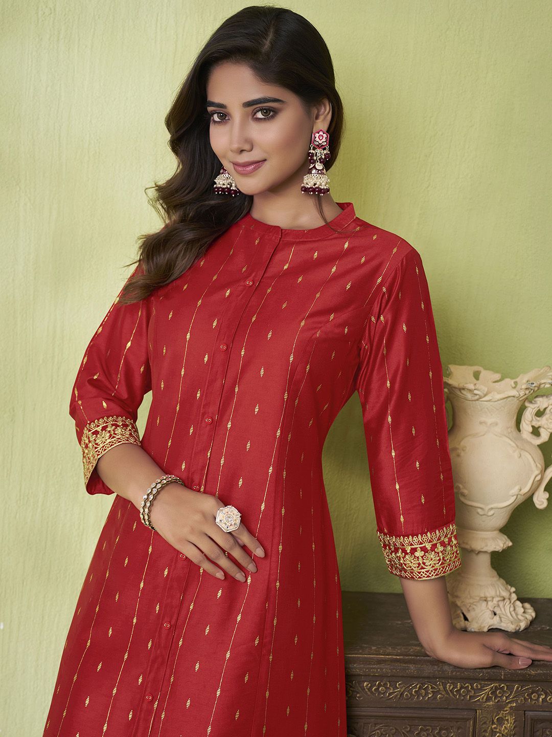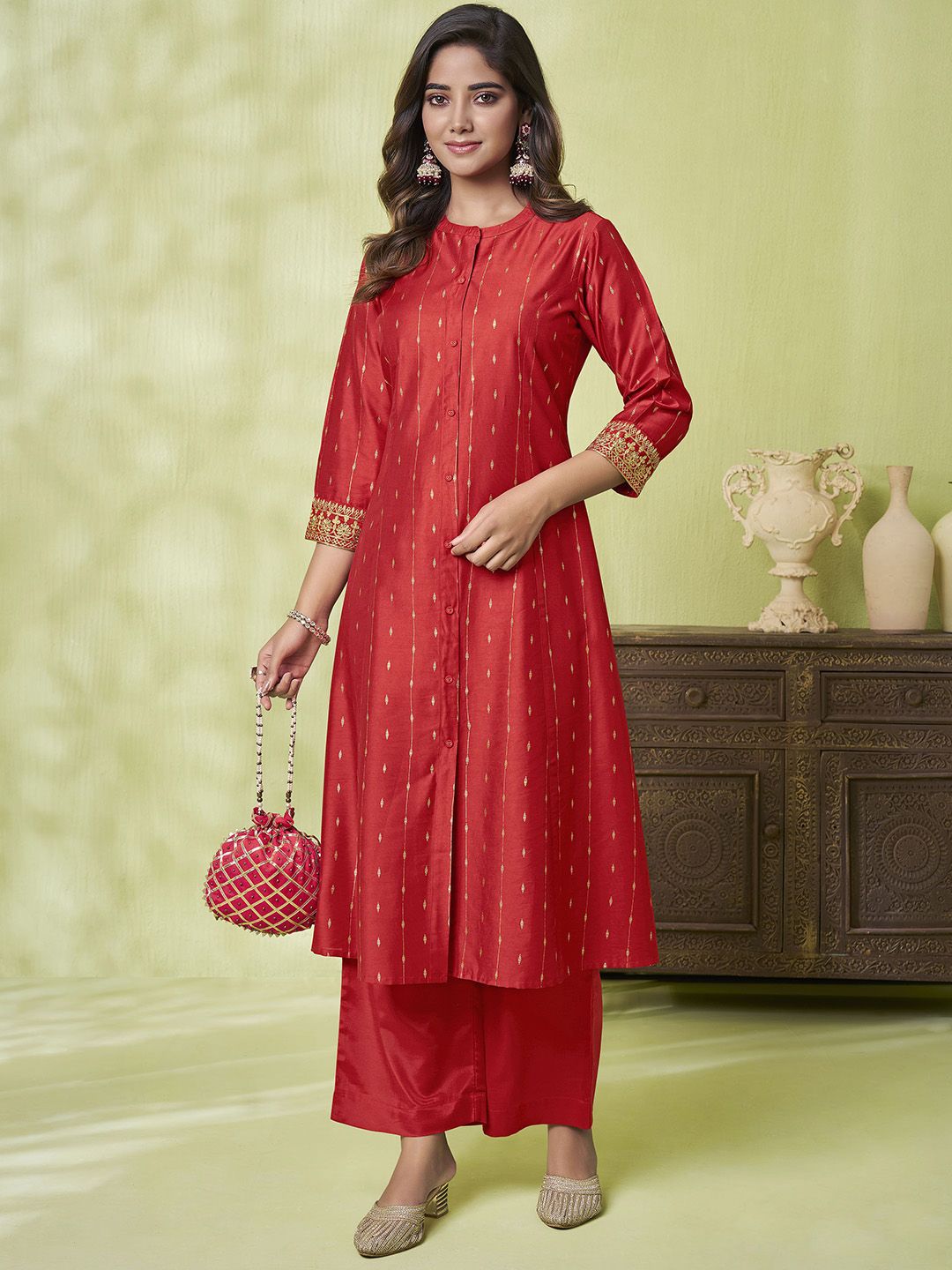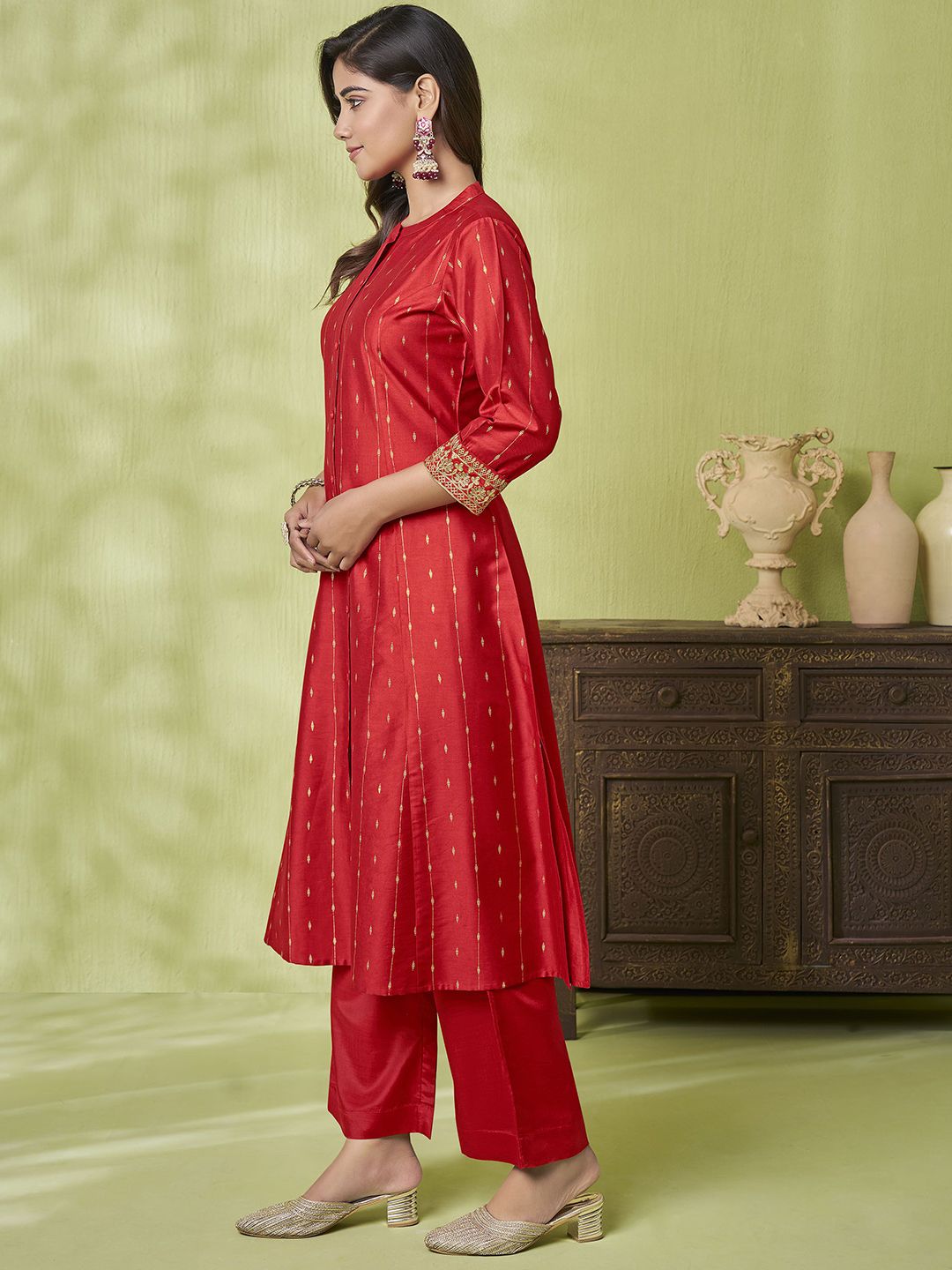 Label Khoj Women Cotton Slub Embroidery , Foil Print Work Red Color Kurta & Bottom Set