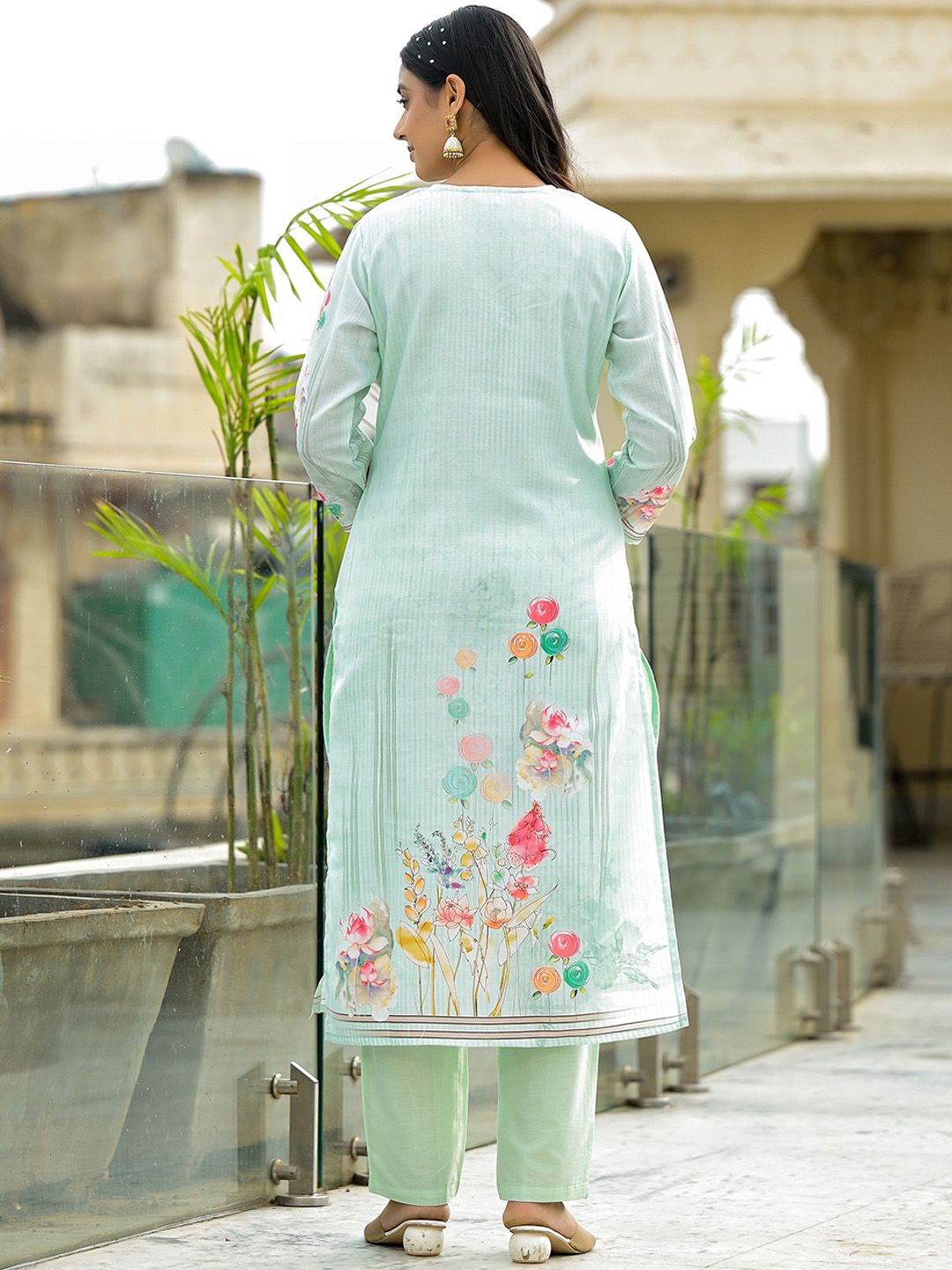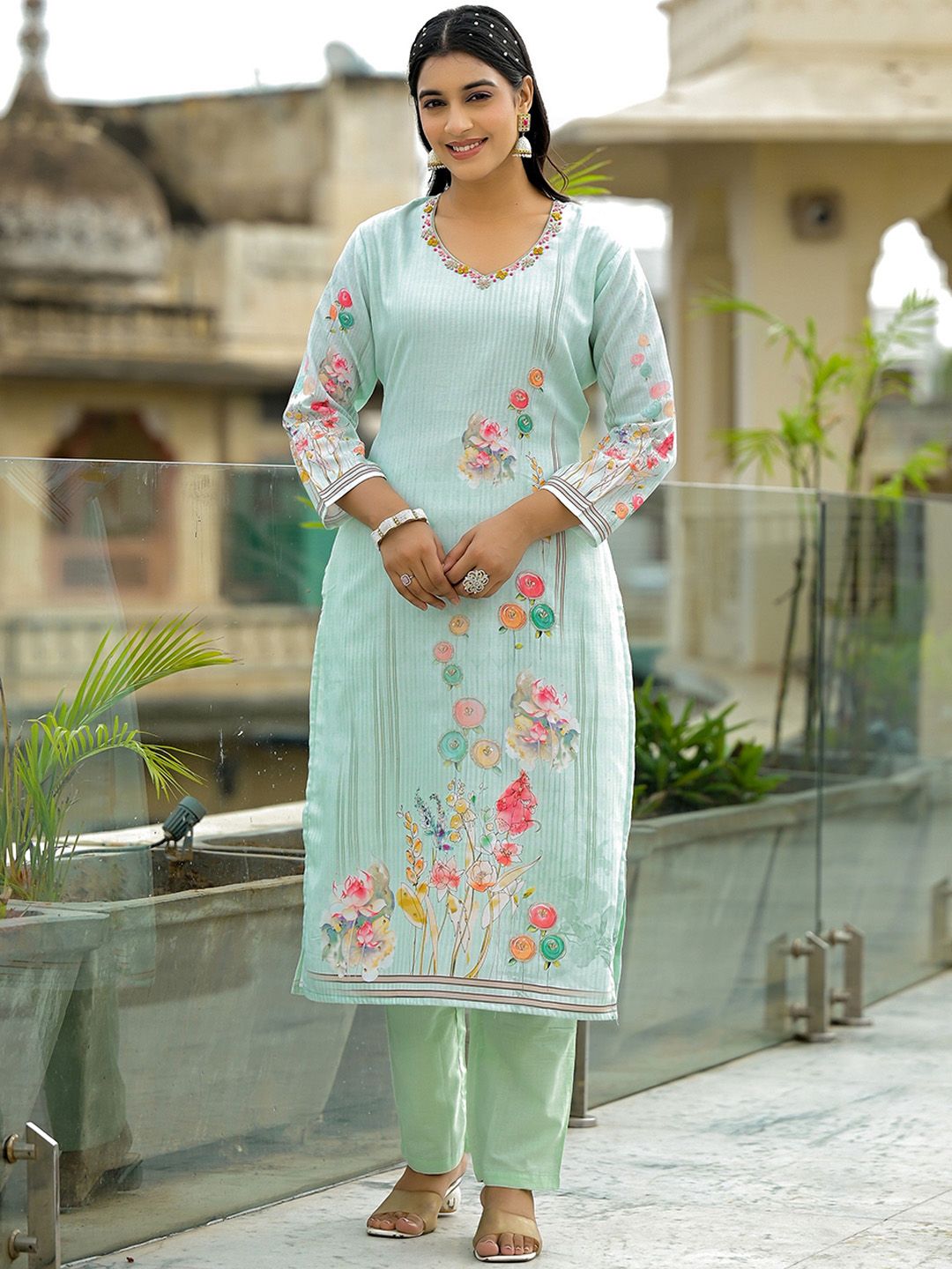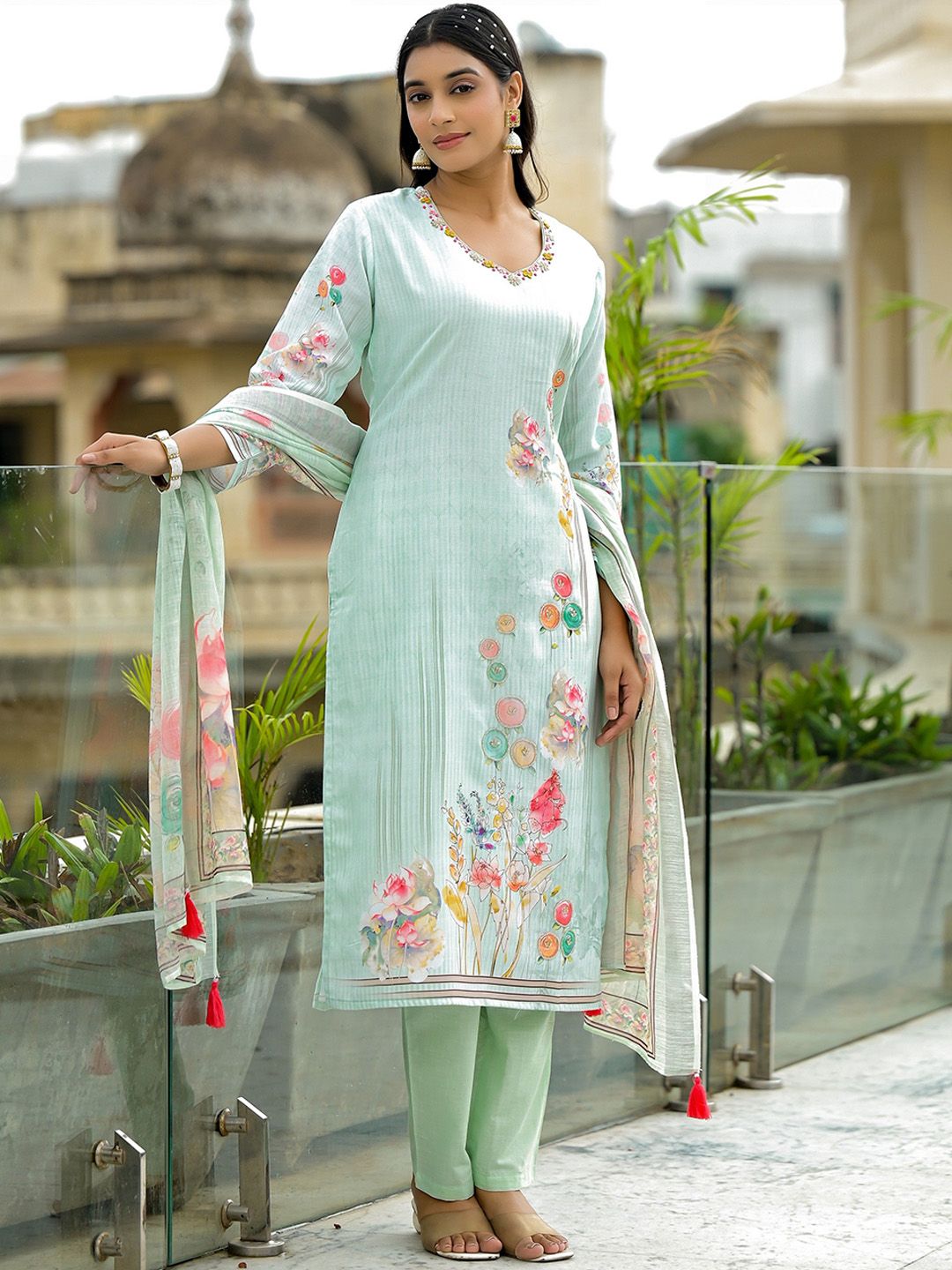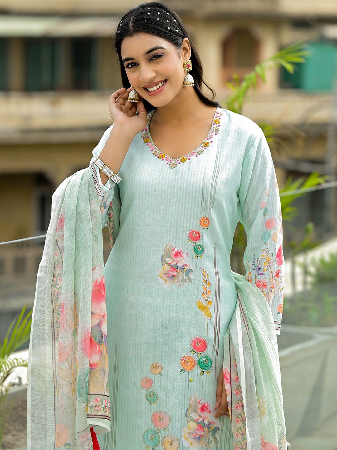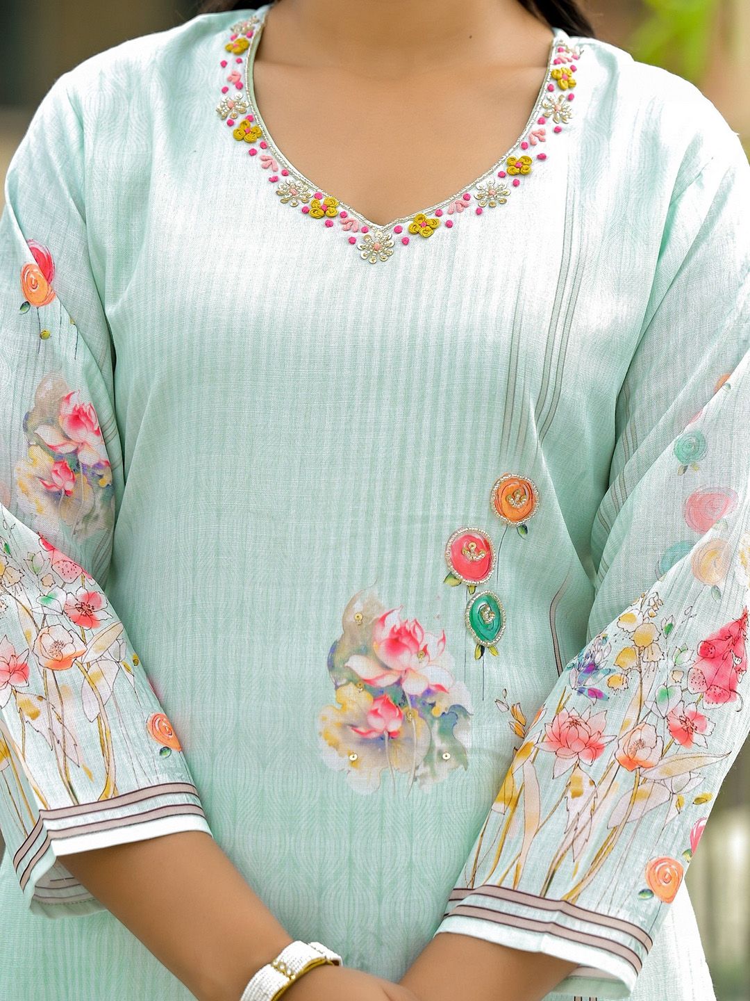 Label Khoj Women Lilen Print Kurta, Trouser And Dupptta Set Linen Green Color