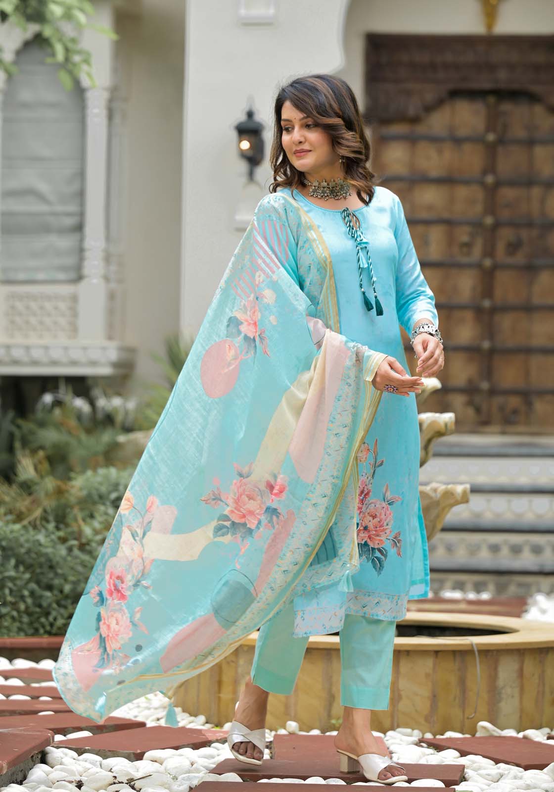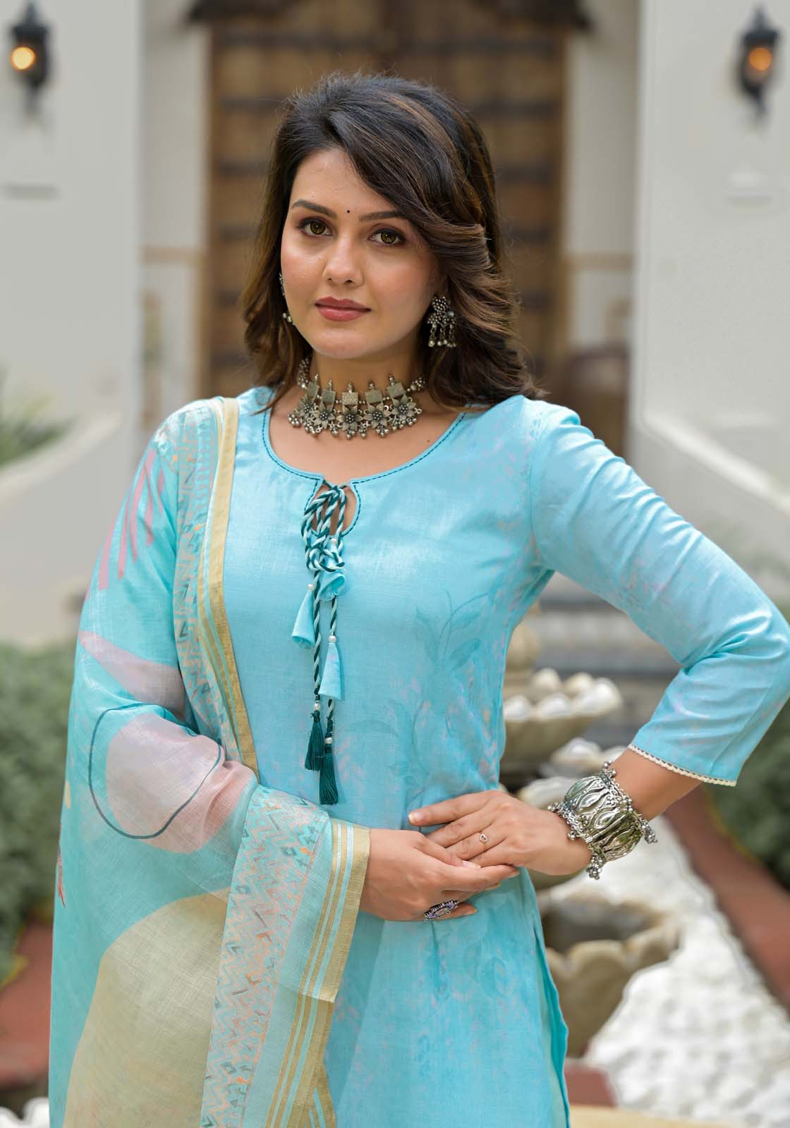 Label Khoj Women Lilen print kurta, trouser and dupptta set