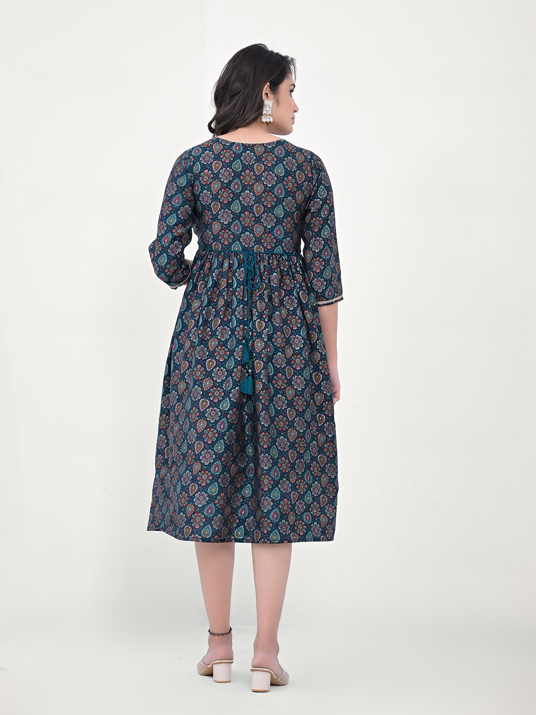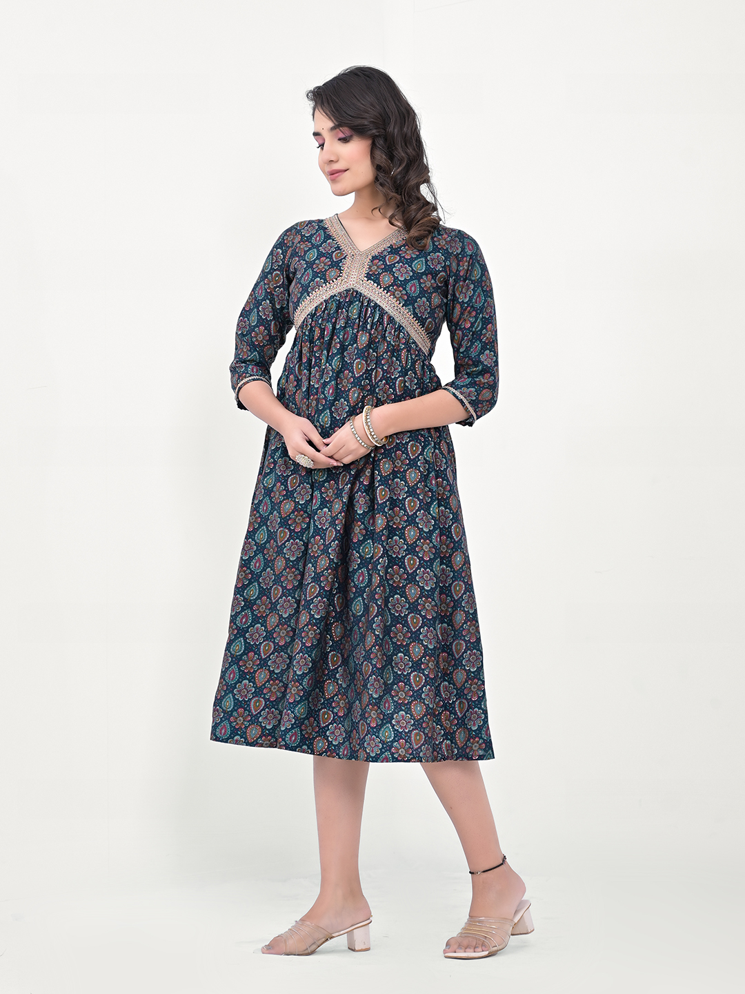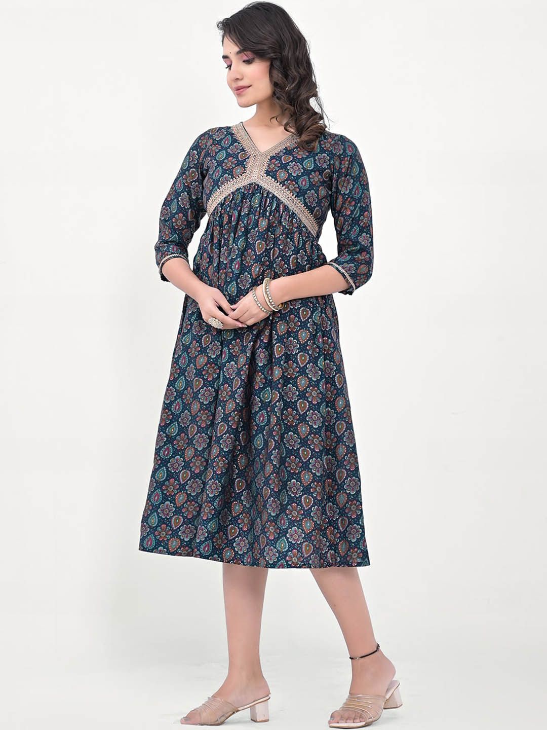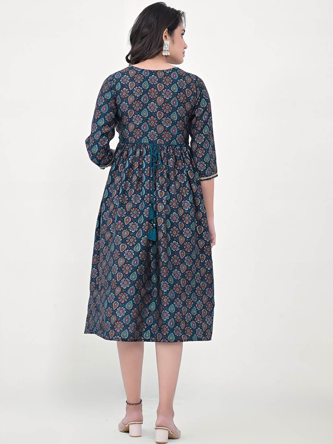 - Navy blue floral printed a-line ethnic dress