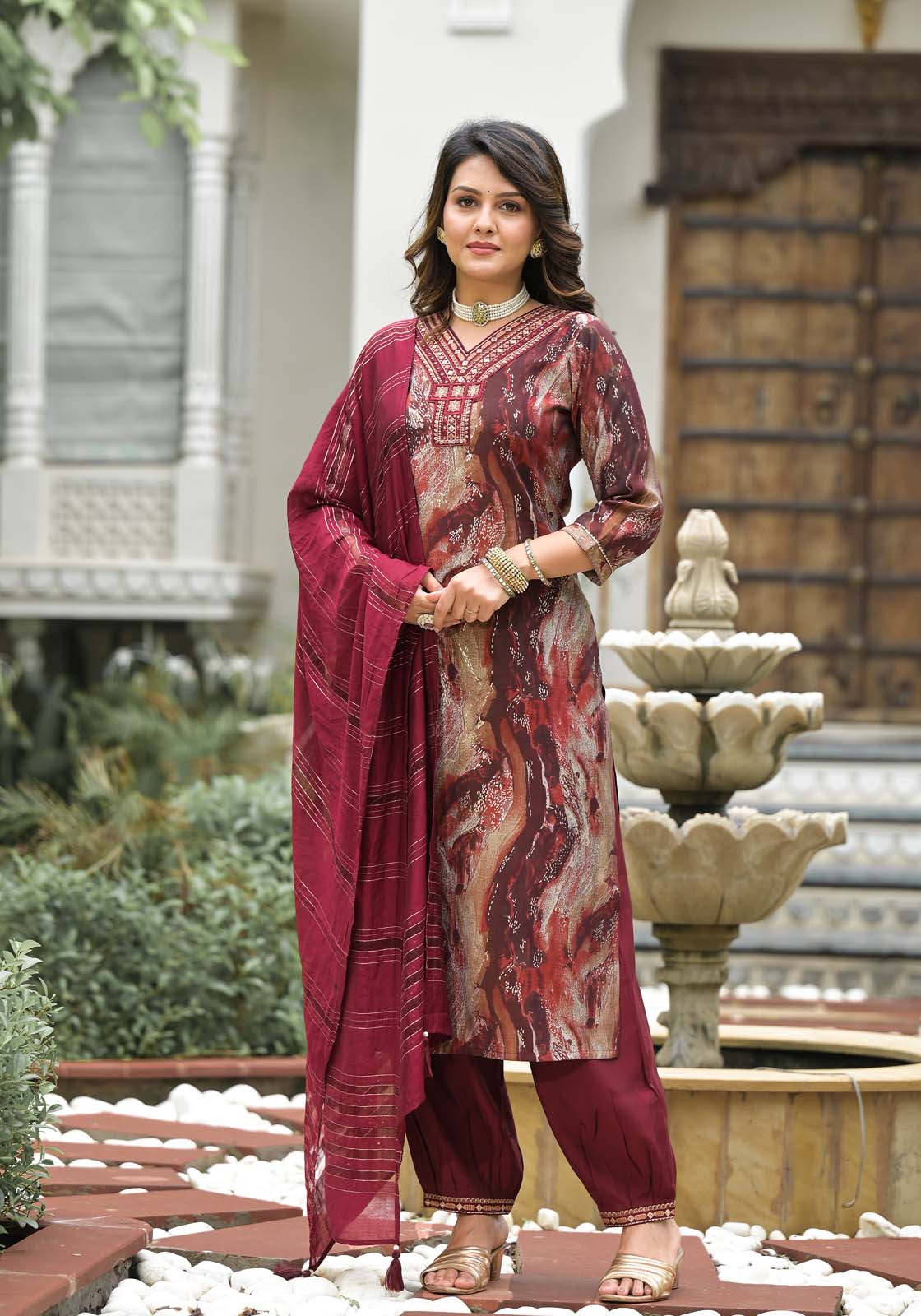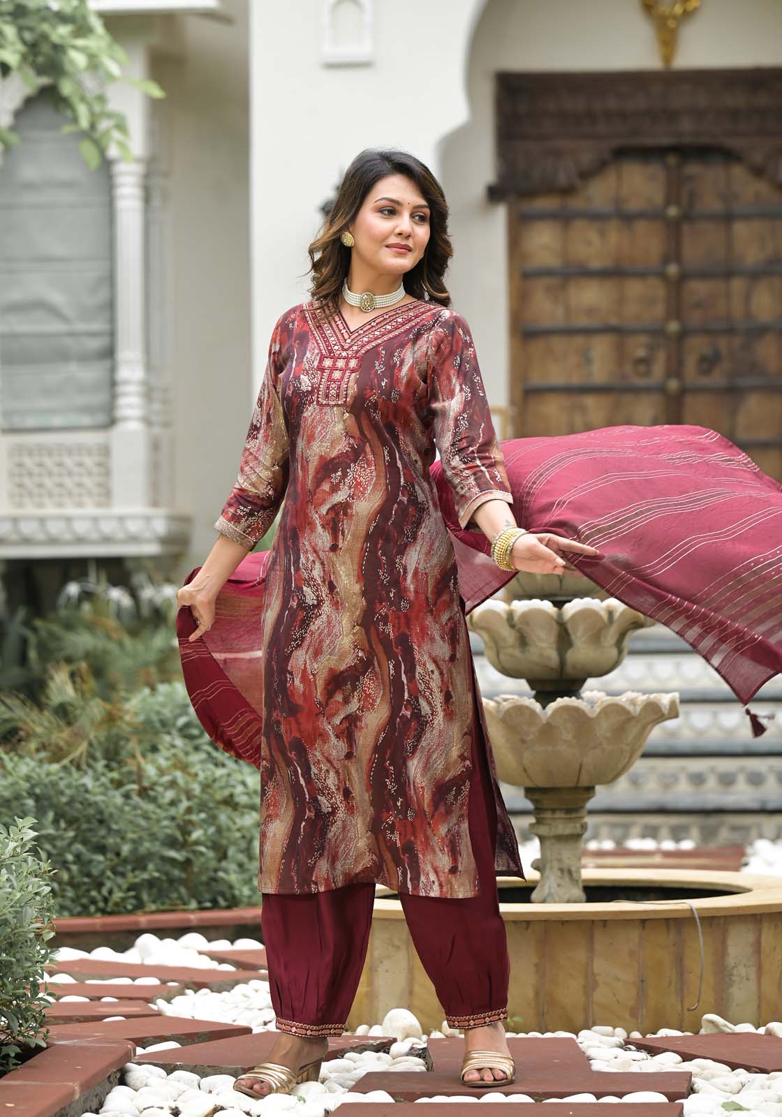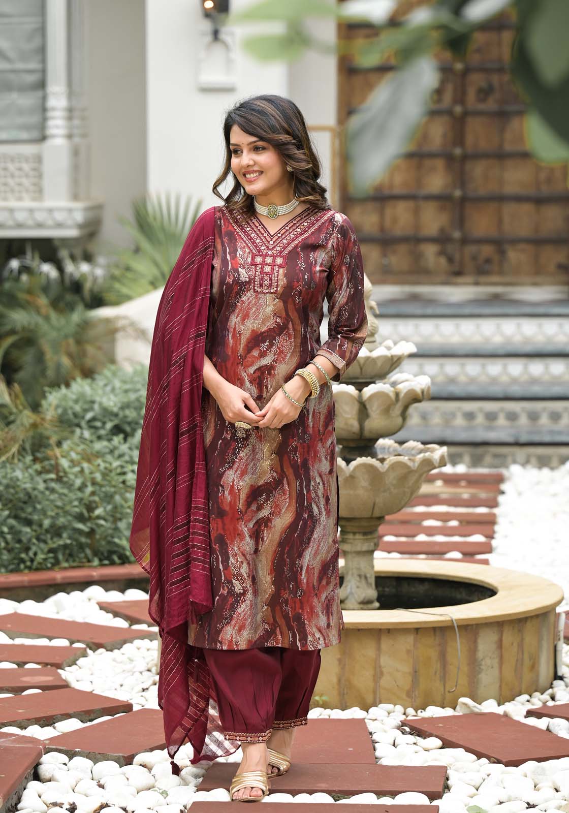 - The vibrant kurta features an eye-catching print, paired with comfortable trousers and a matching dupatta.