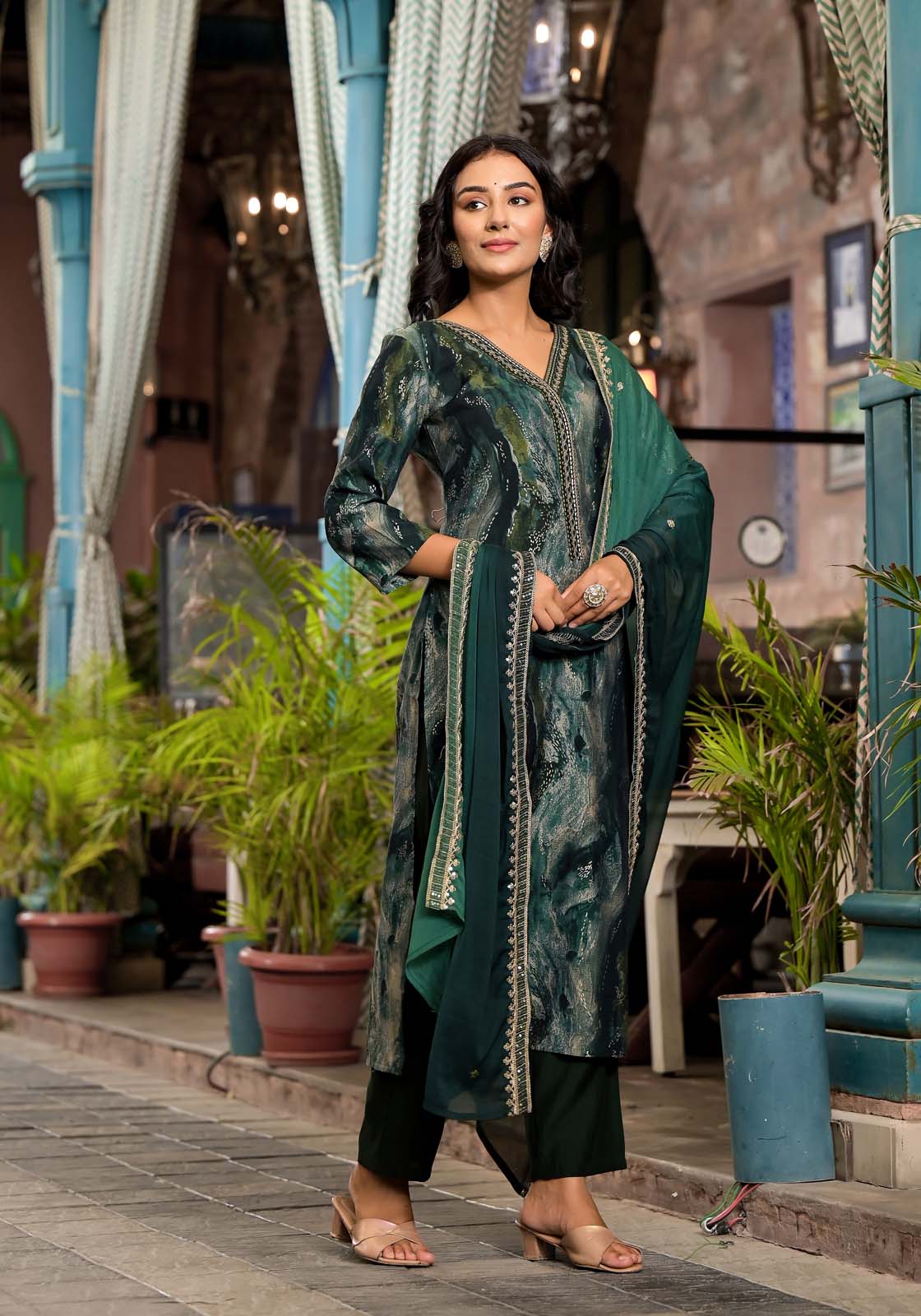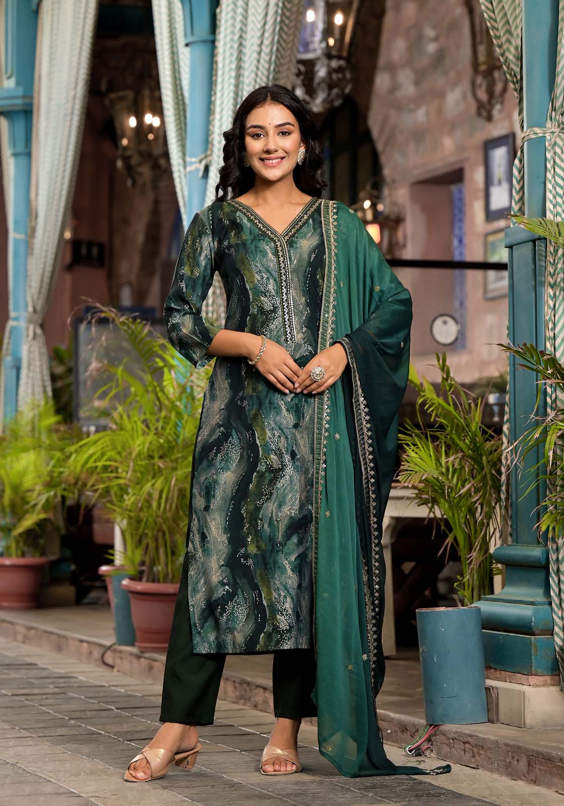 - Elevate your ethnic style with this stunning Label Khoj Women printed kurta, trouser, and dupatta set.