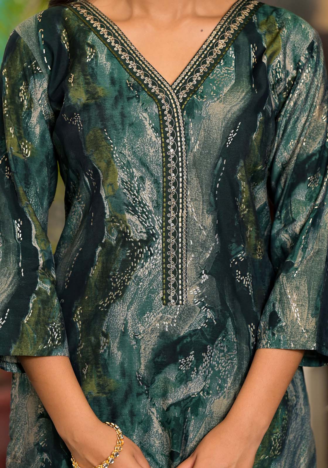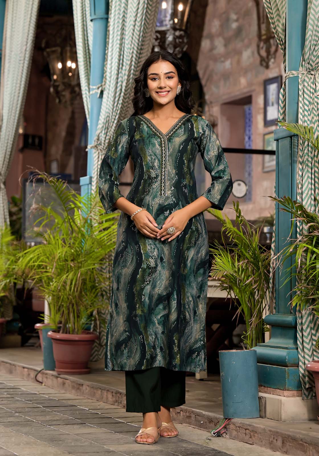 - The vibrant kurta features an eye-catching print, paired with comfortable trousers and a matching dupatta.