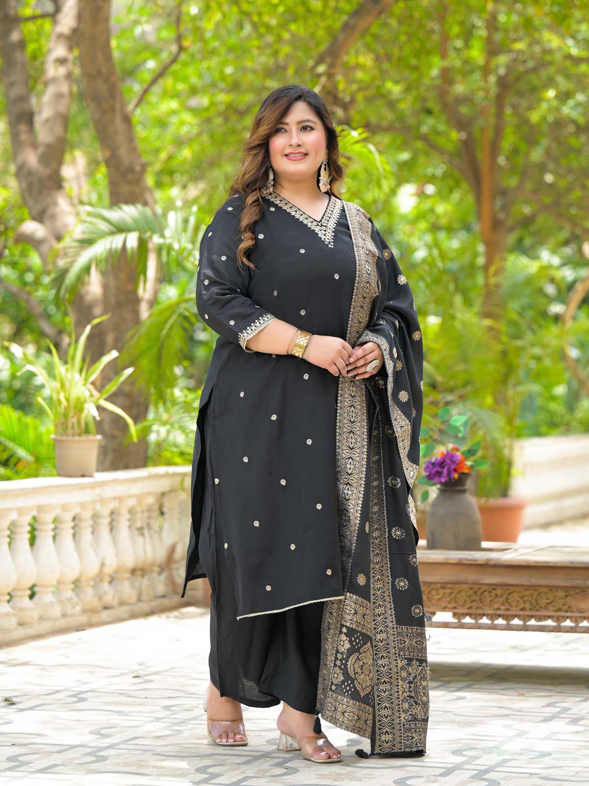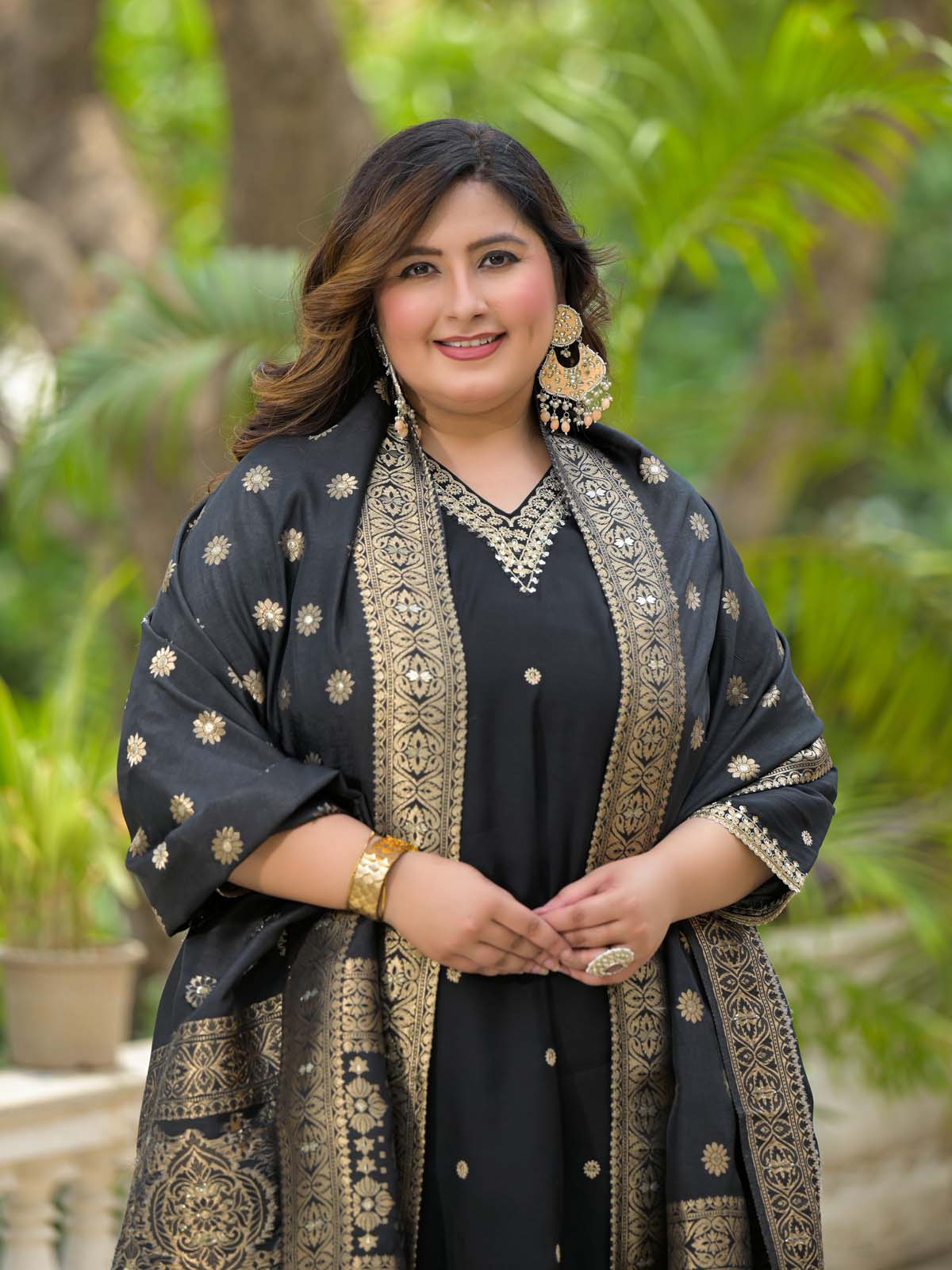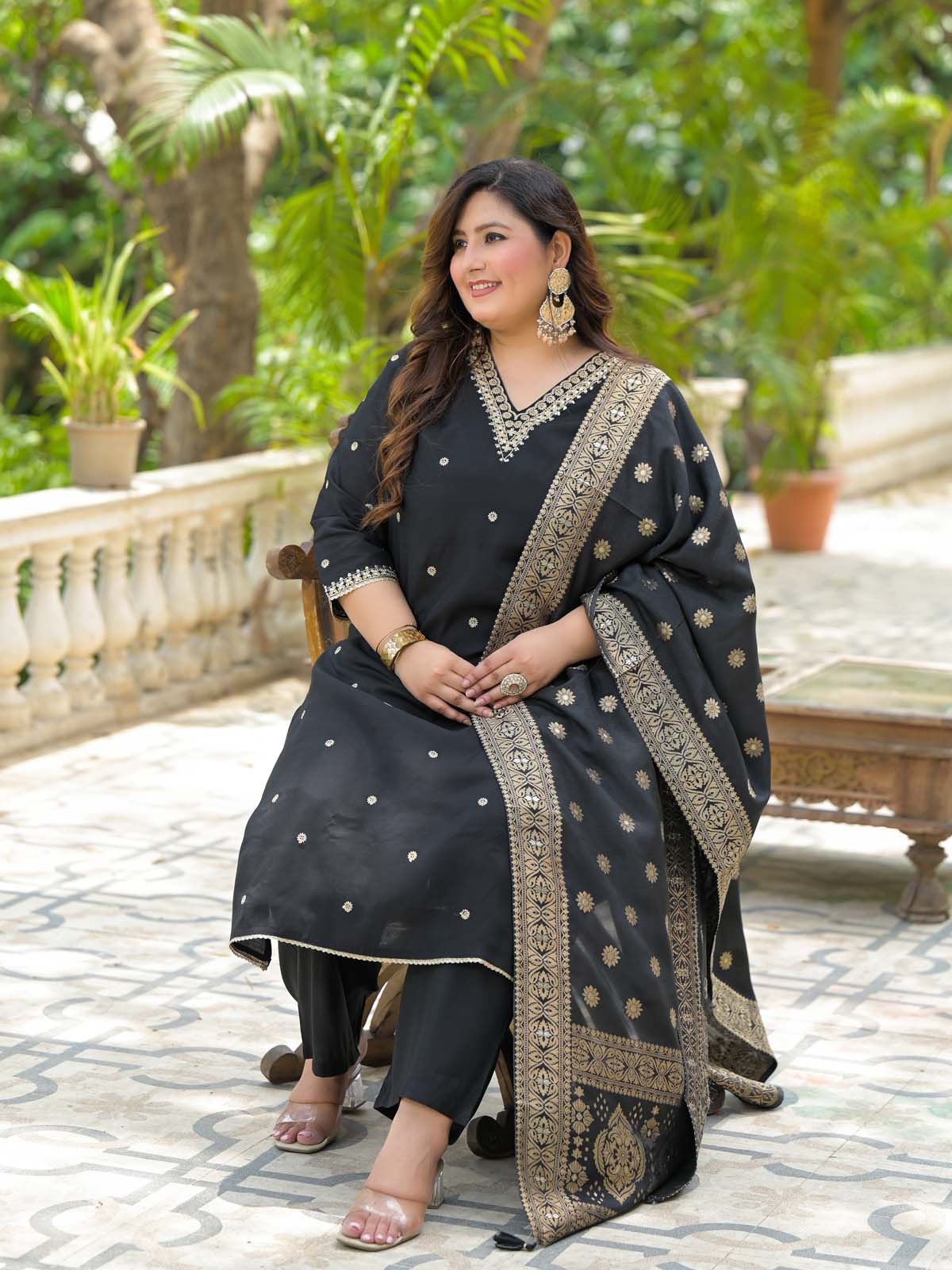 Label Khoj Women Roman Silk Embroidery Work Black Color Kurta & Bottom With Dupatta Set