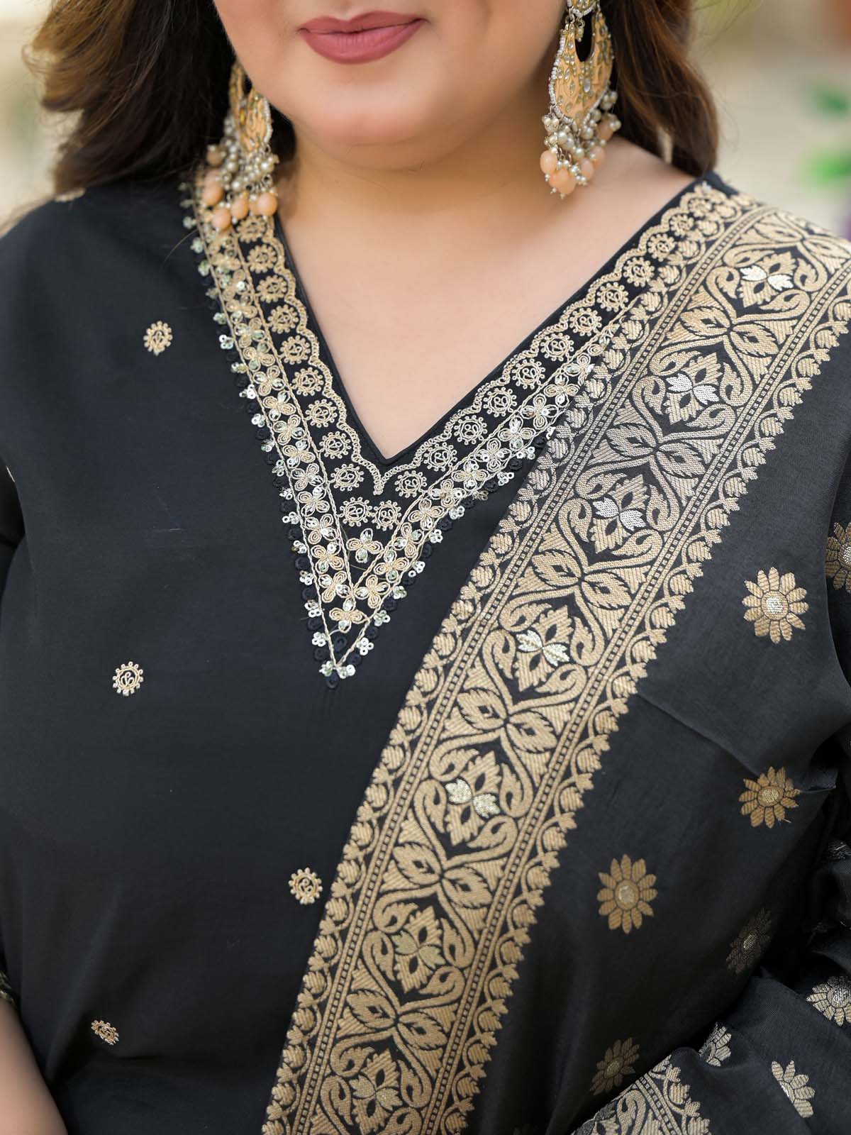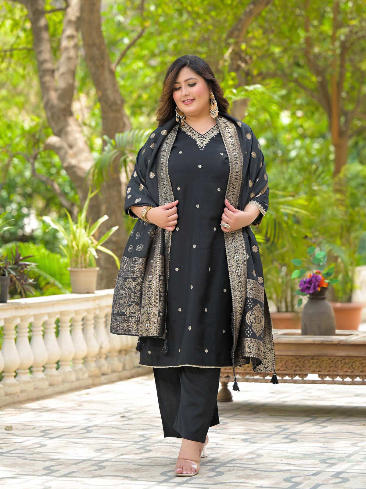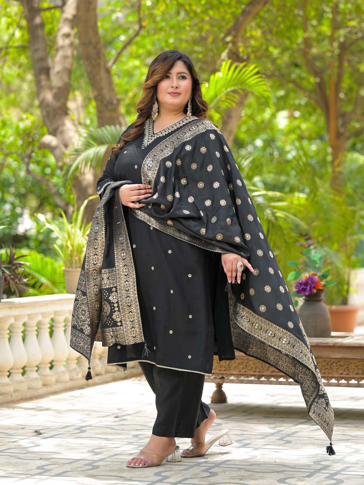 Label Khoj Women Roman Silk Embroidery Work Black Color Kurta & Bottom With Dupatta Set