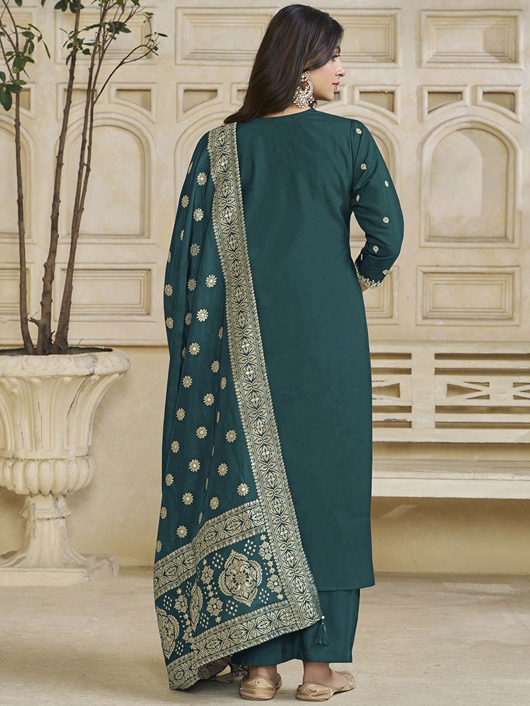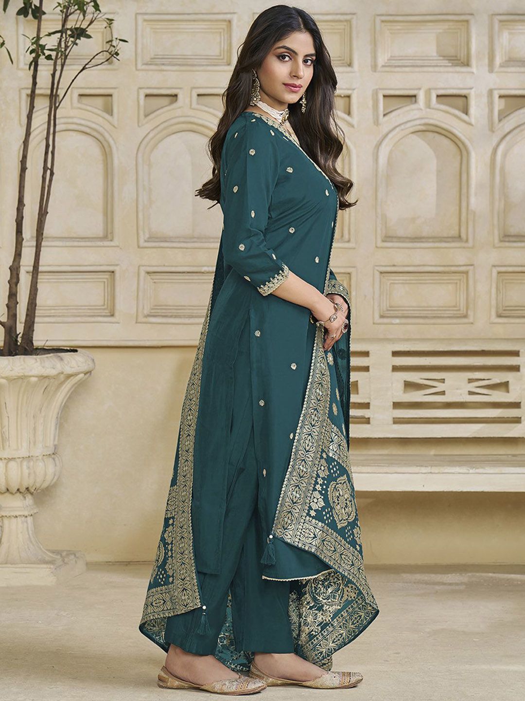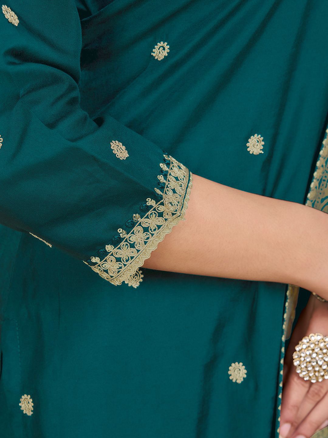 Label Khoj Women Roman Silk Embroidery Work Firoji Color Kurta & Bottom With Dupatta Set