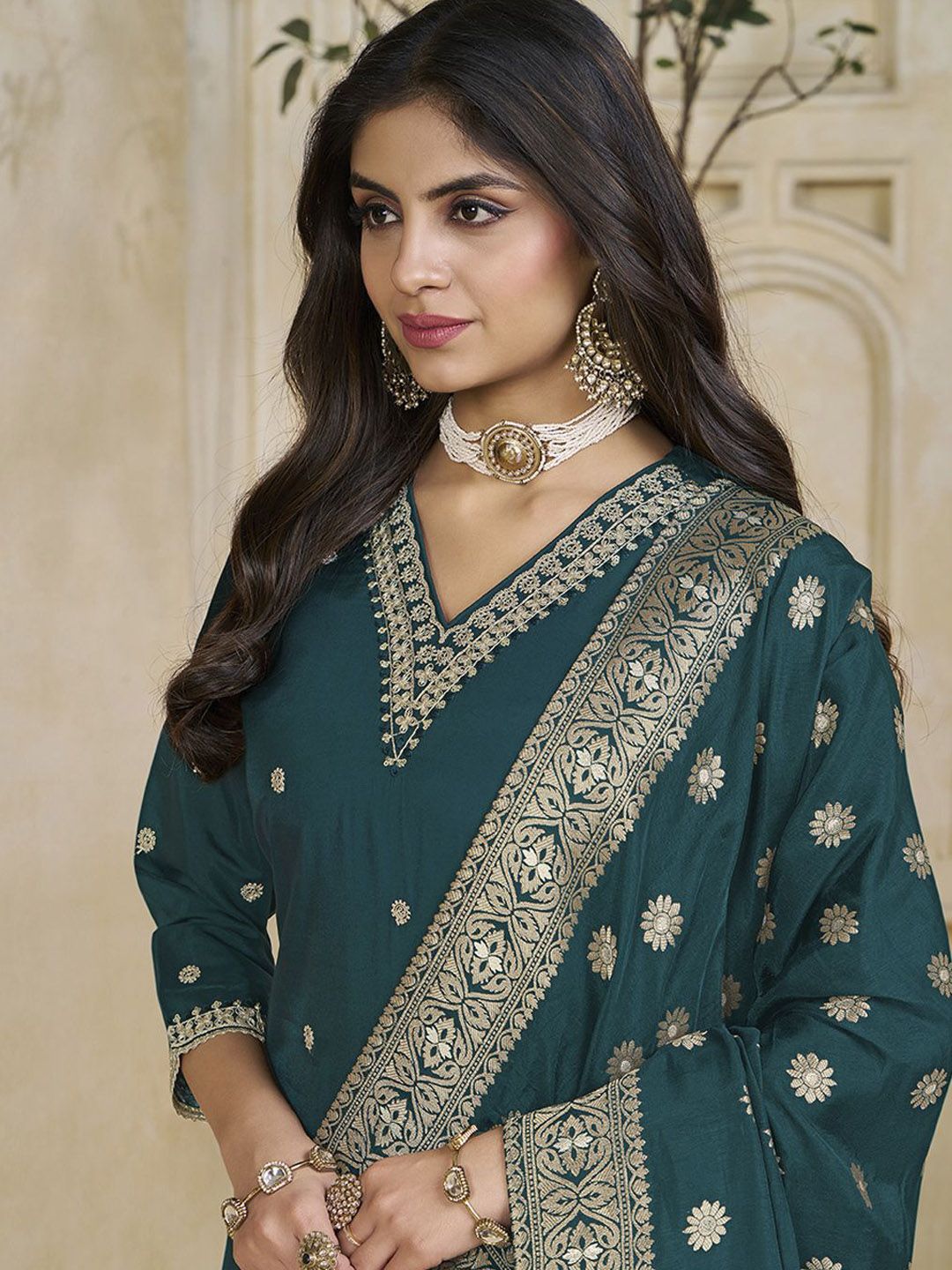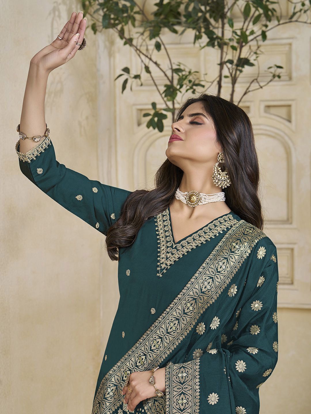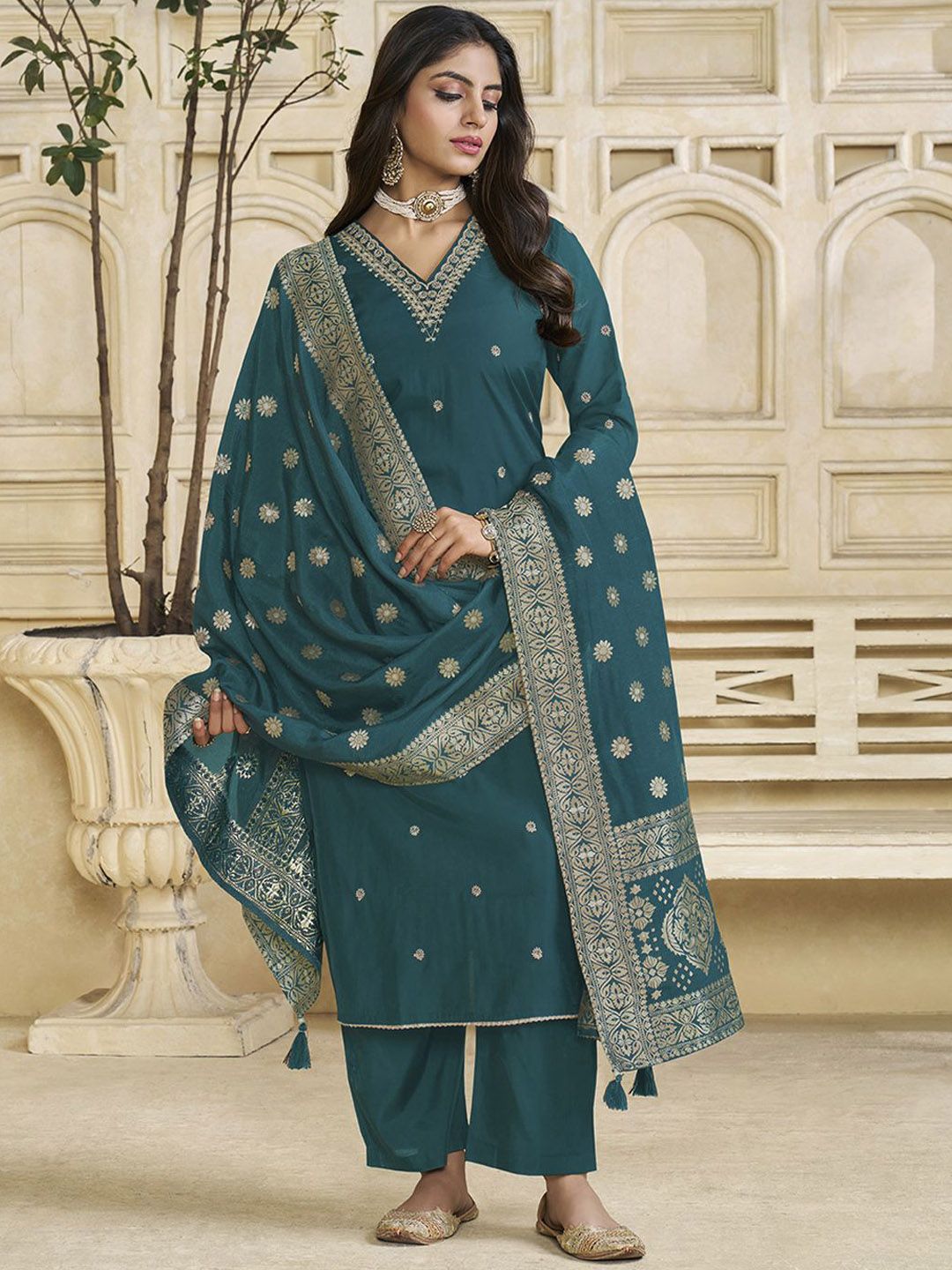 Label Khoj Women Roman Silk Embroidery Work Firoji Color Kurta & Bottom With Dupatta Set