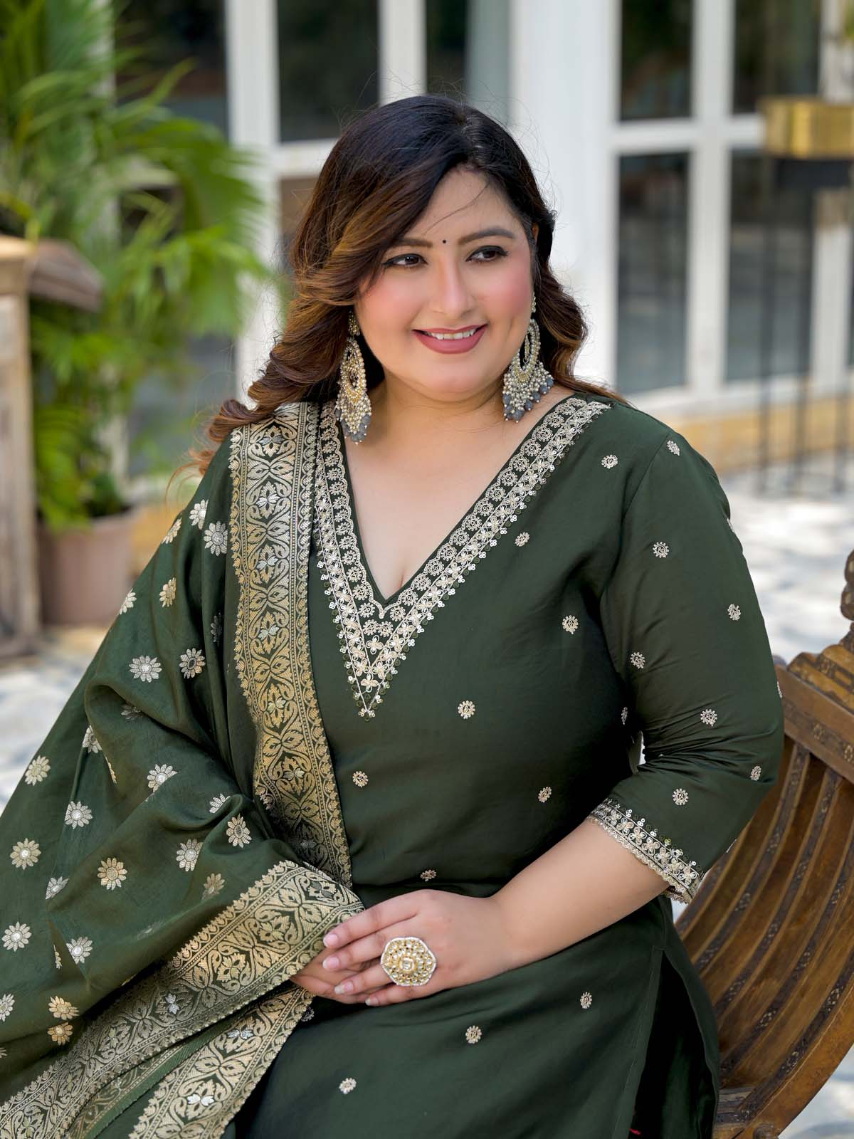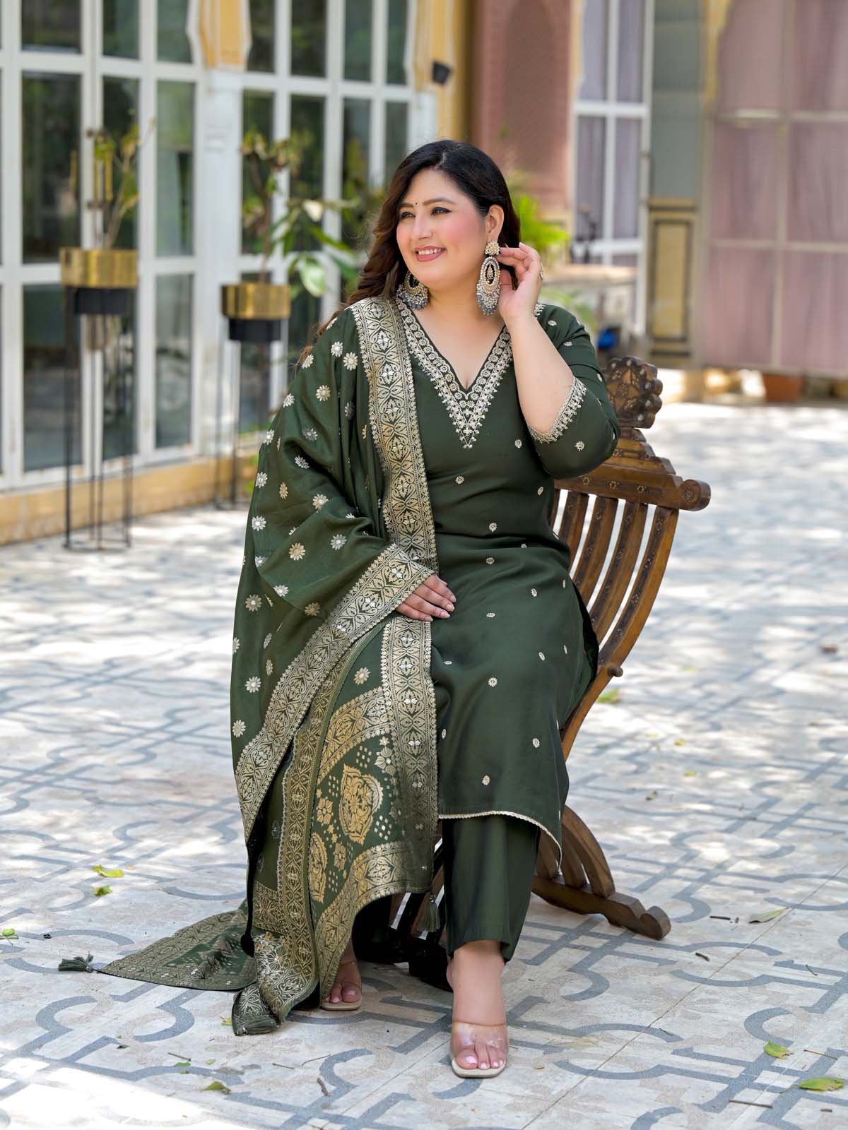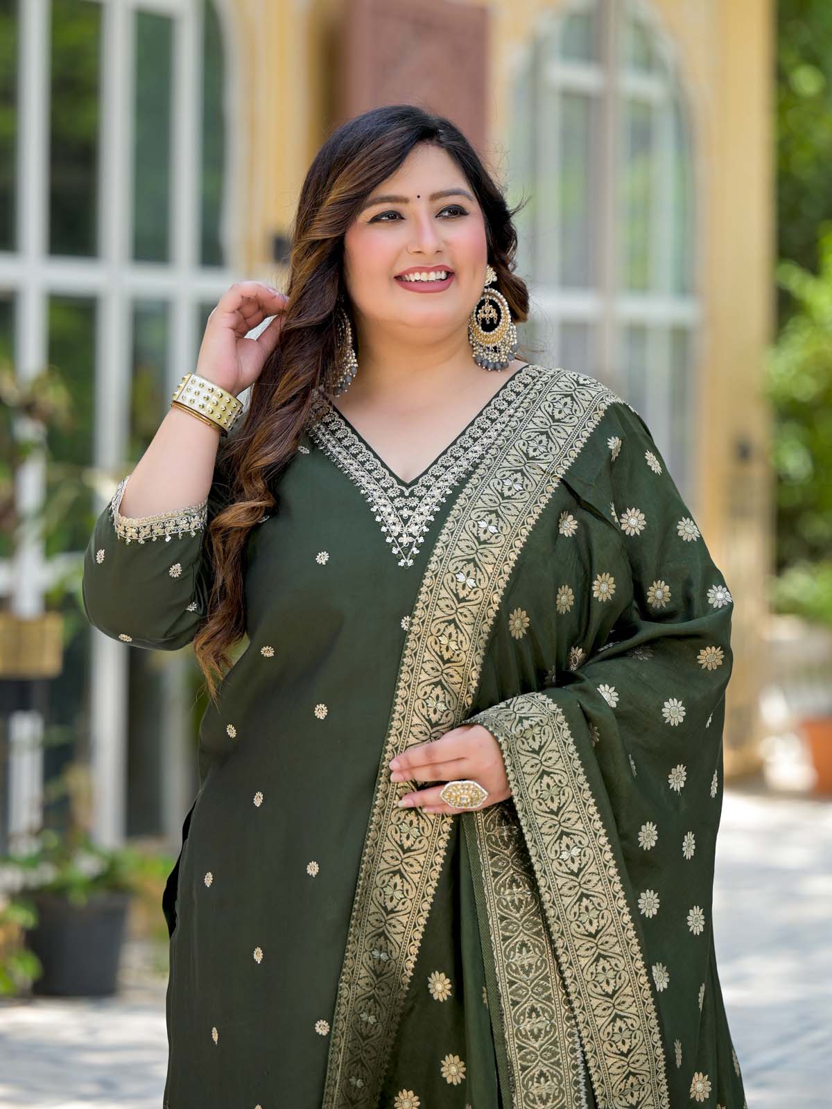 Label Khoj Women Roman Silk Embroidery Work Mehndi Color Kurta & Bottom With Dupatta Set