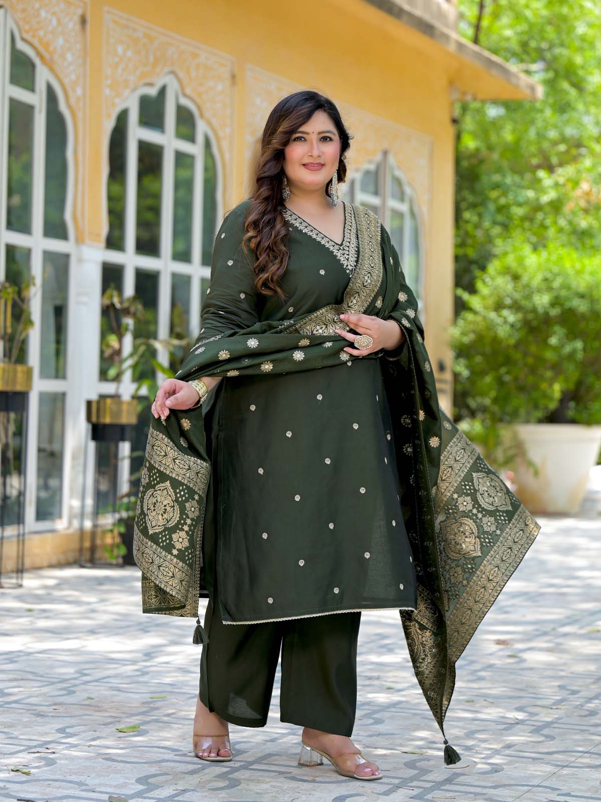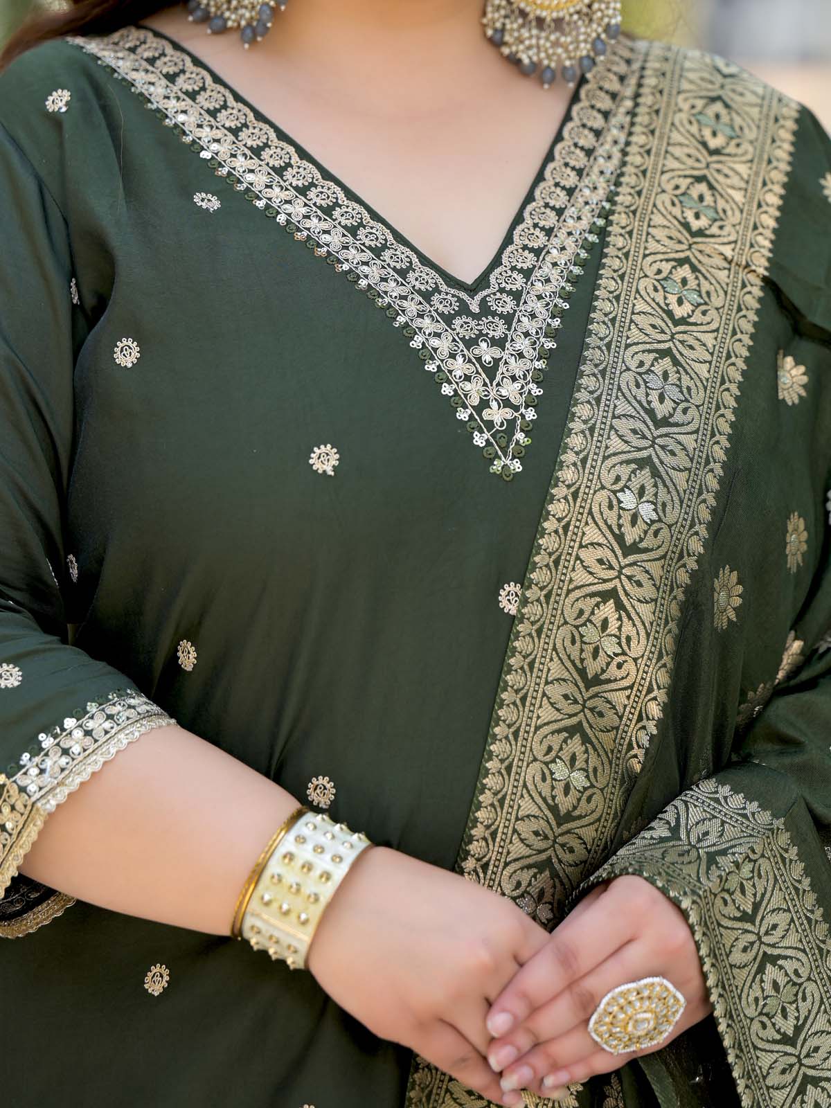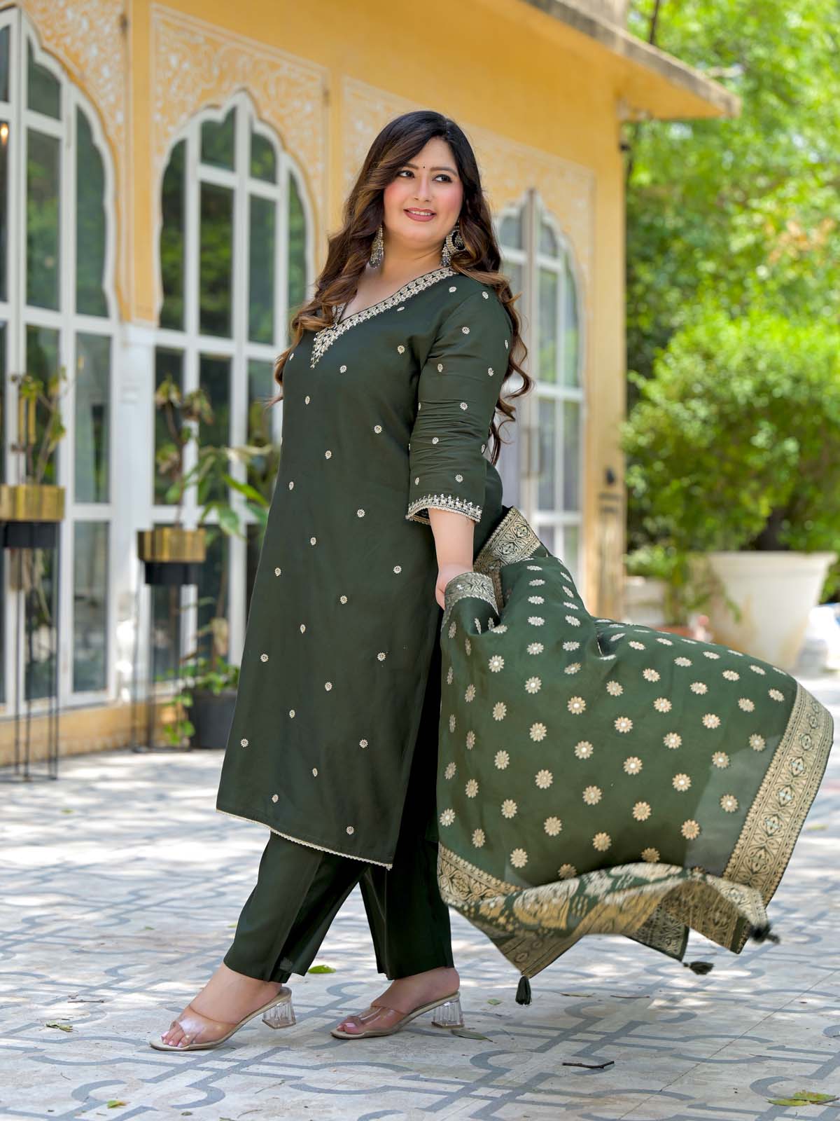 Label Khoj Women Roman Silk Embroidery Work Mehndi Color Kurta & Bottom With Dupatta Set