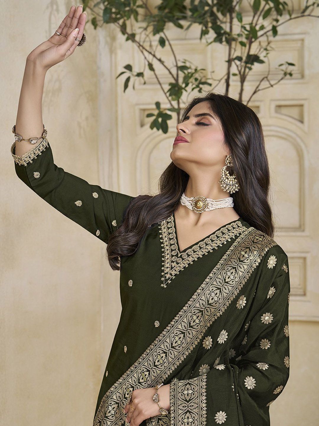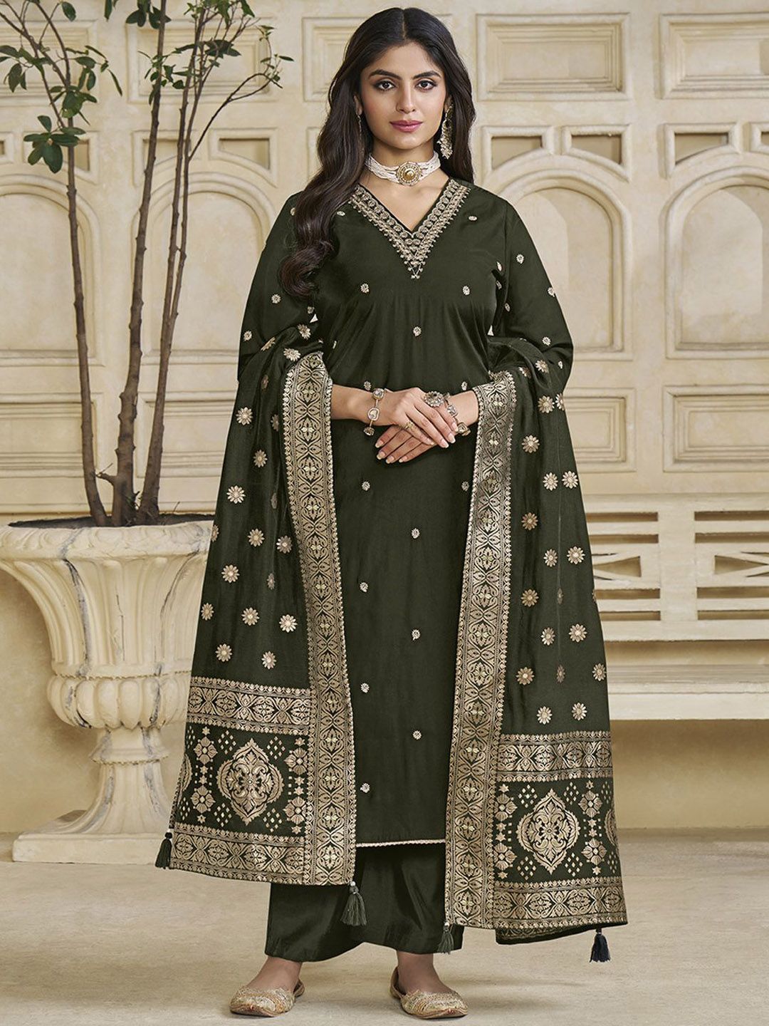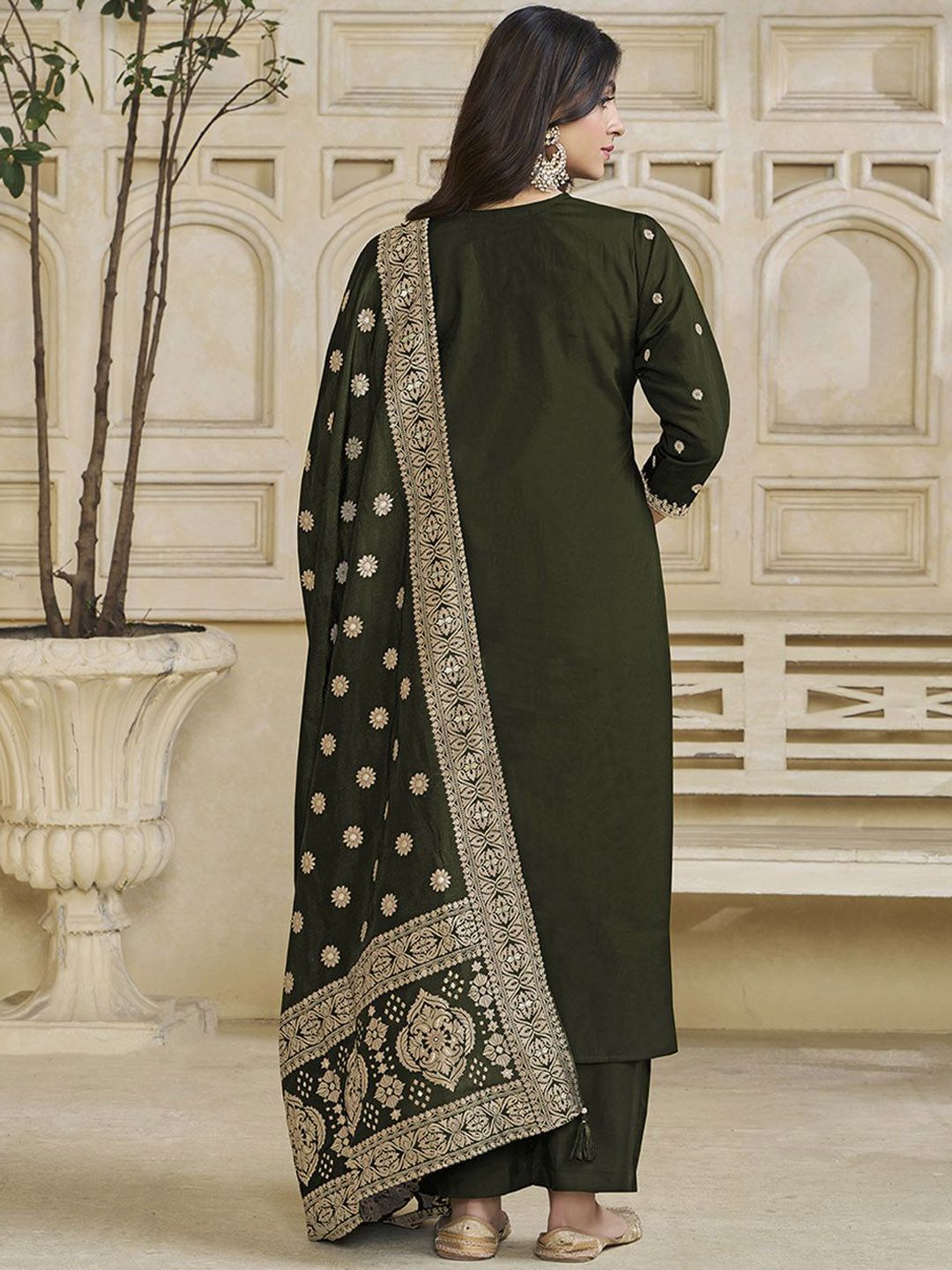 Label Khoj Women Roman Silk Embroidery Work Mehndi Color Kurta & Bottom With Dupatta Set