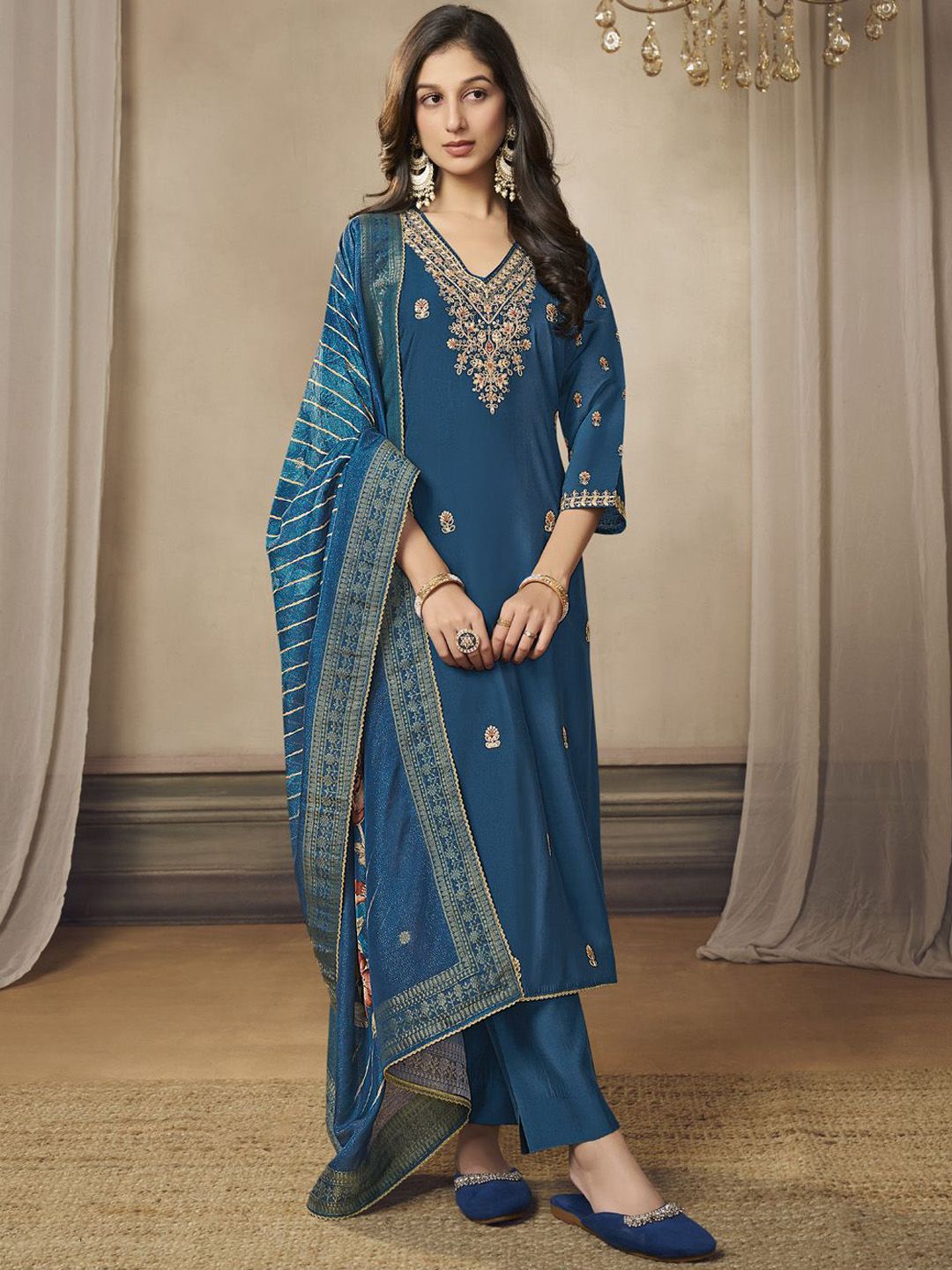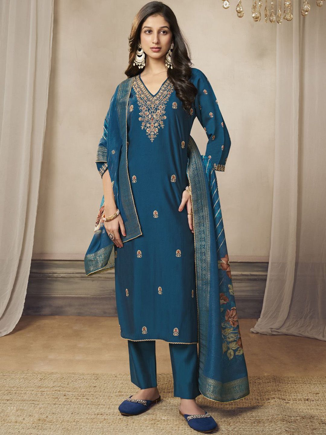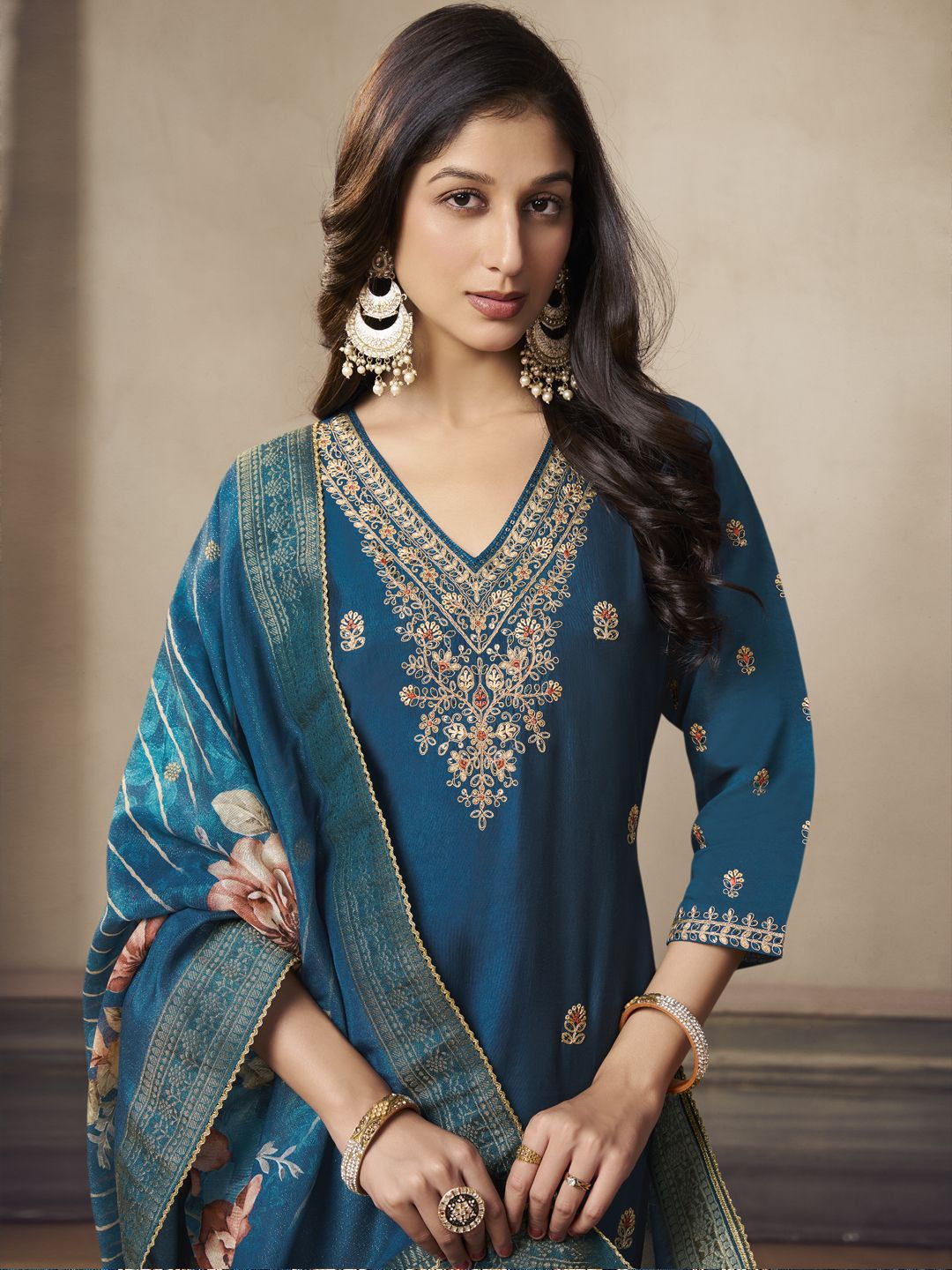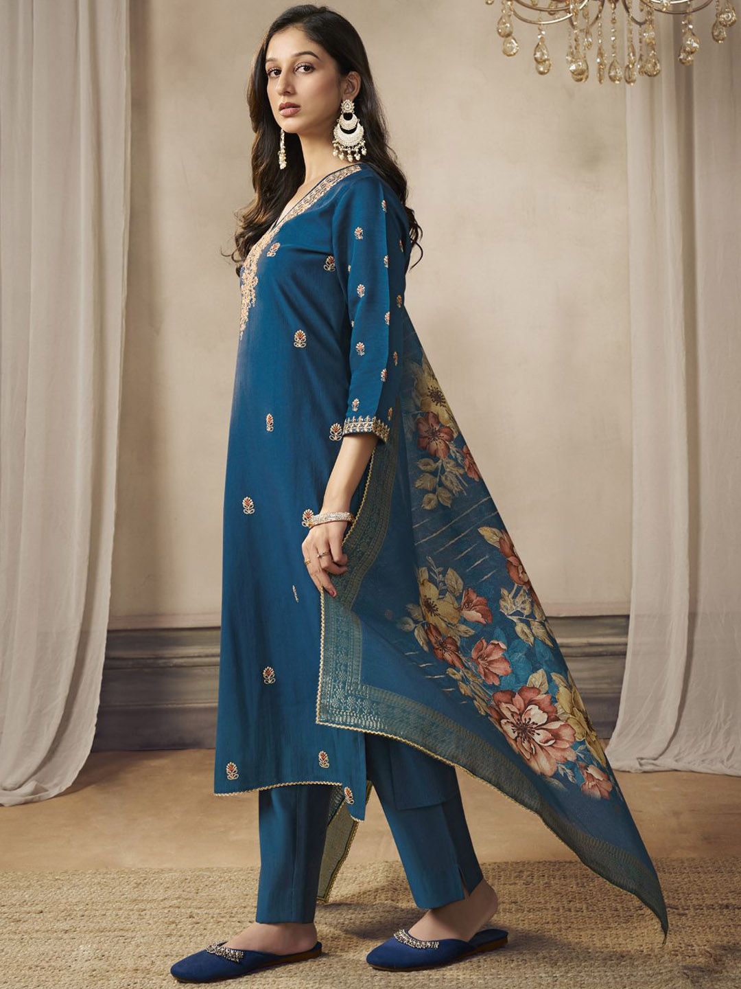 Blue, peach, gold-toned embroidered kurta with trouser and dupatta