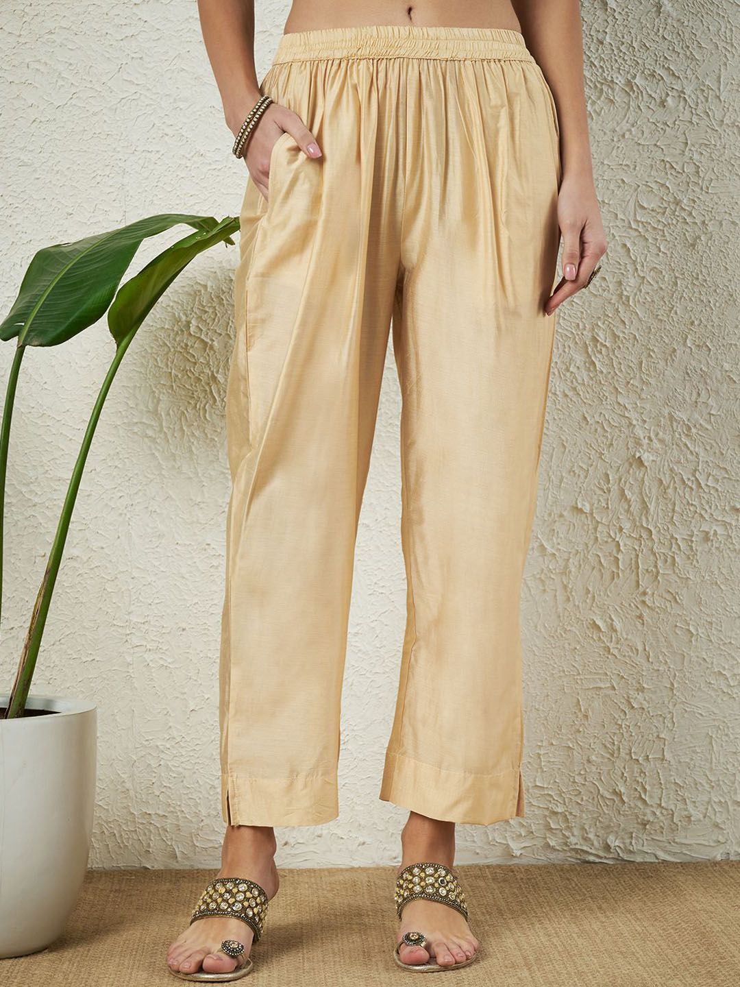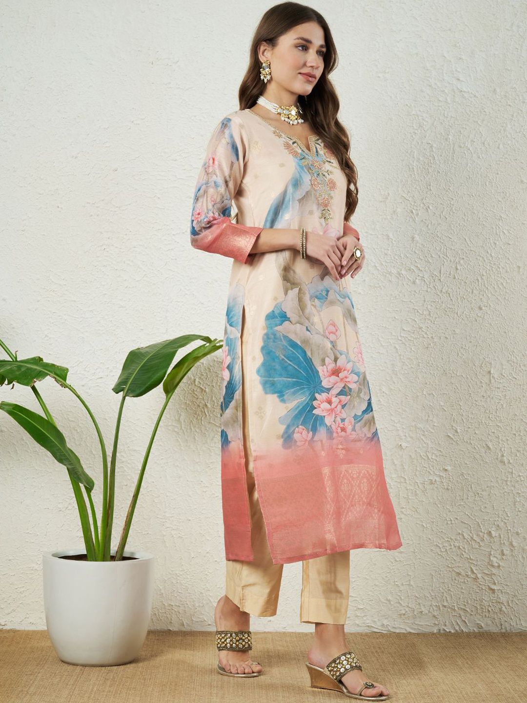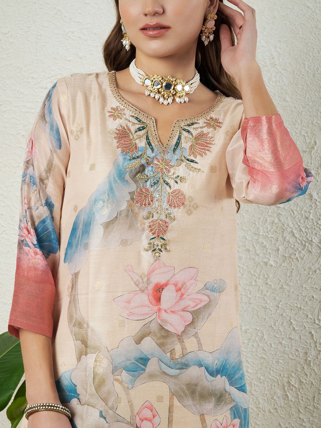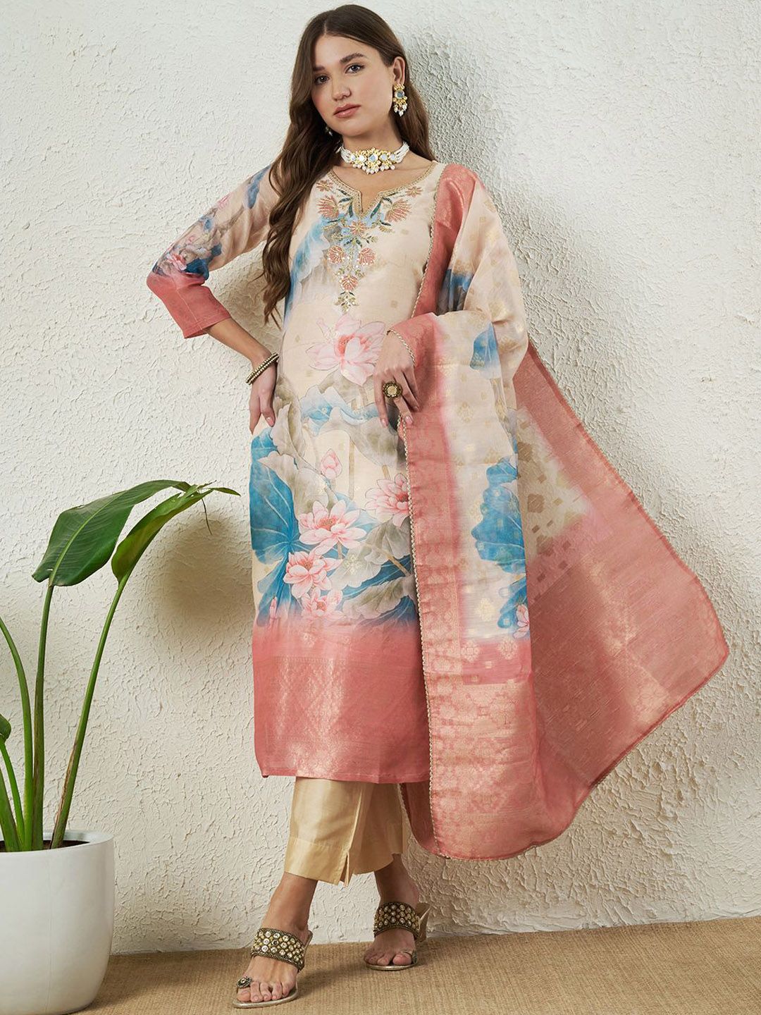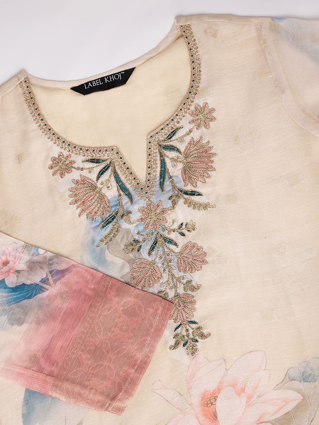 Label Khoj Women Silk Jacqured Embroidery Work Cream Color Kurta & Bottom With Dupatta Set