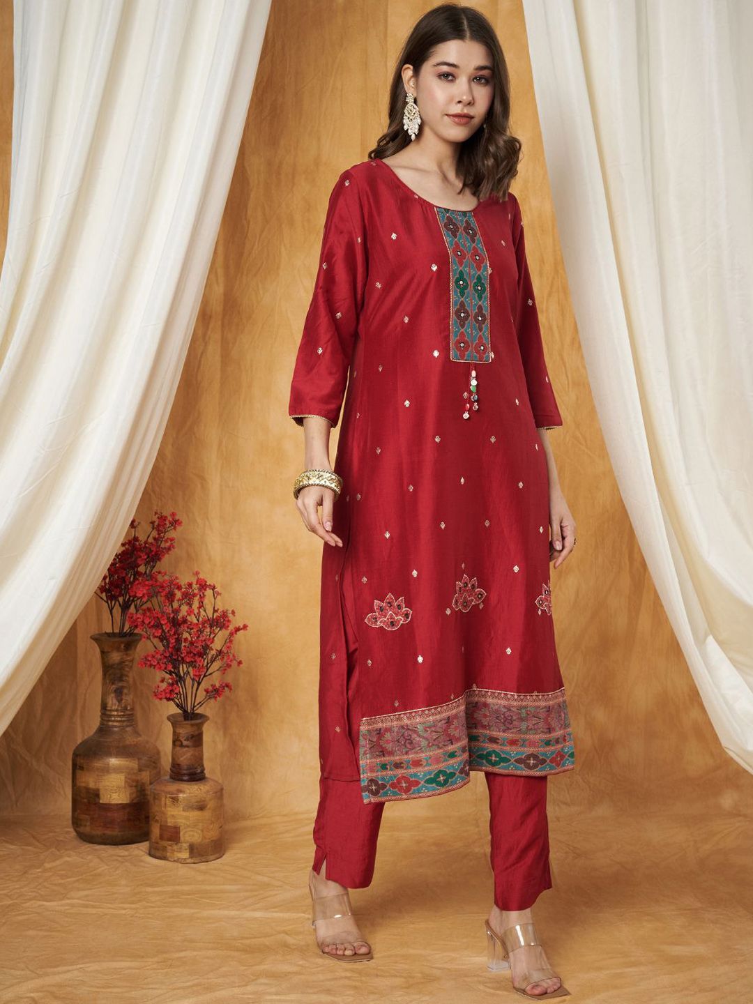 Label Khoj Women’s Black Chinon Hand Embroidery Kurta with Pant and Dupatta