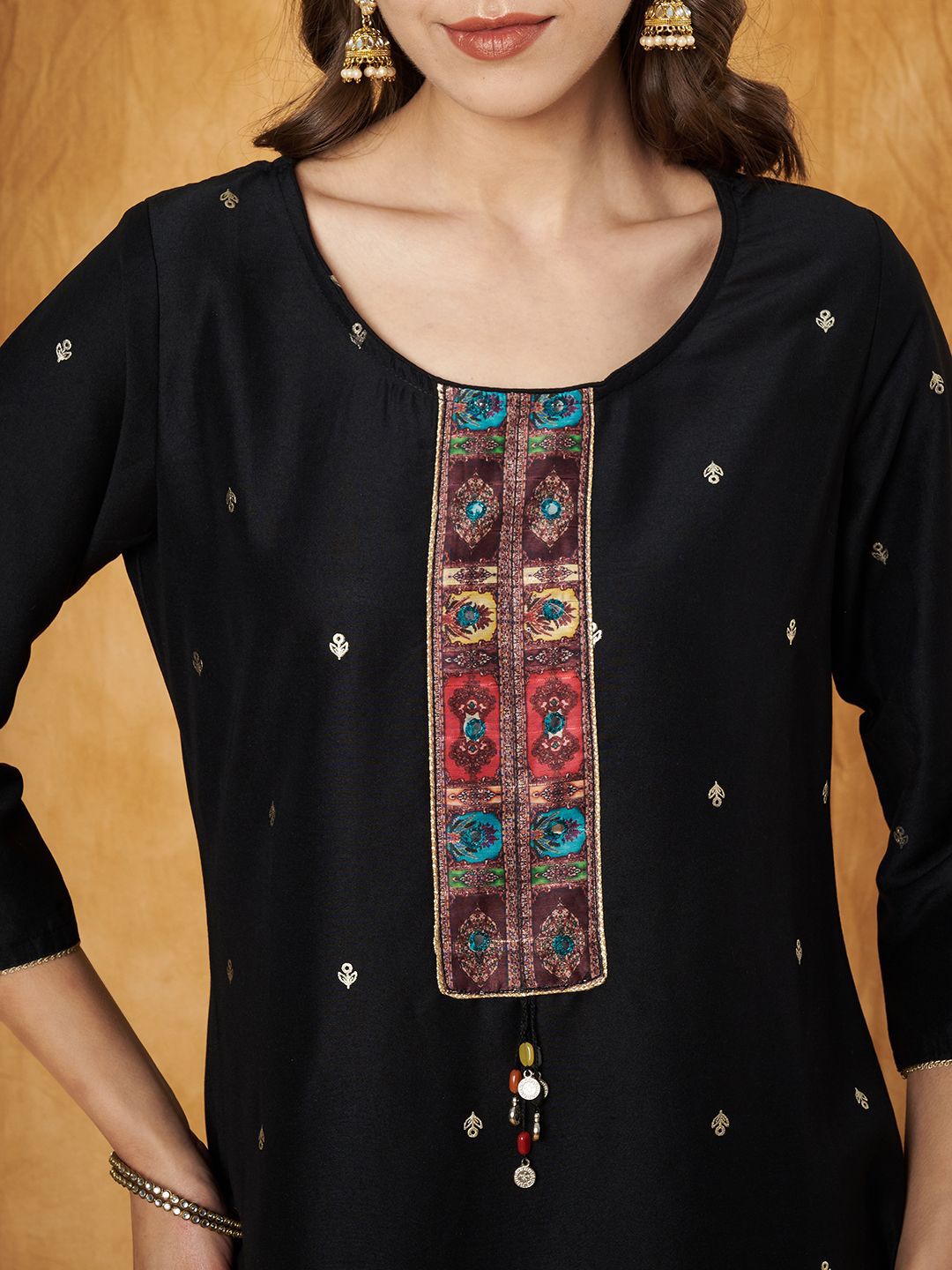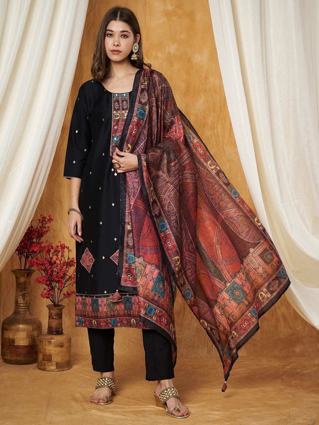 Label Khoj Women’s Black Chinon Hand Embroidery Kurta with Pant and Dupatta