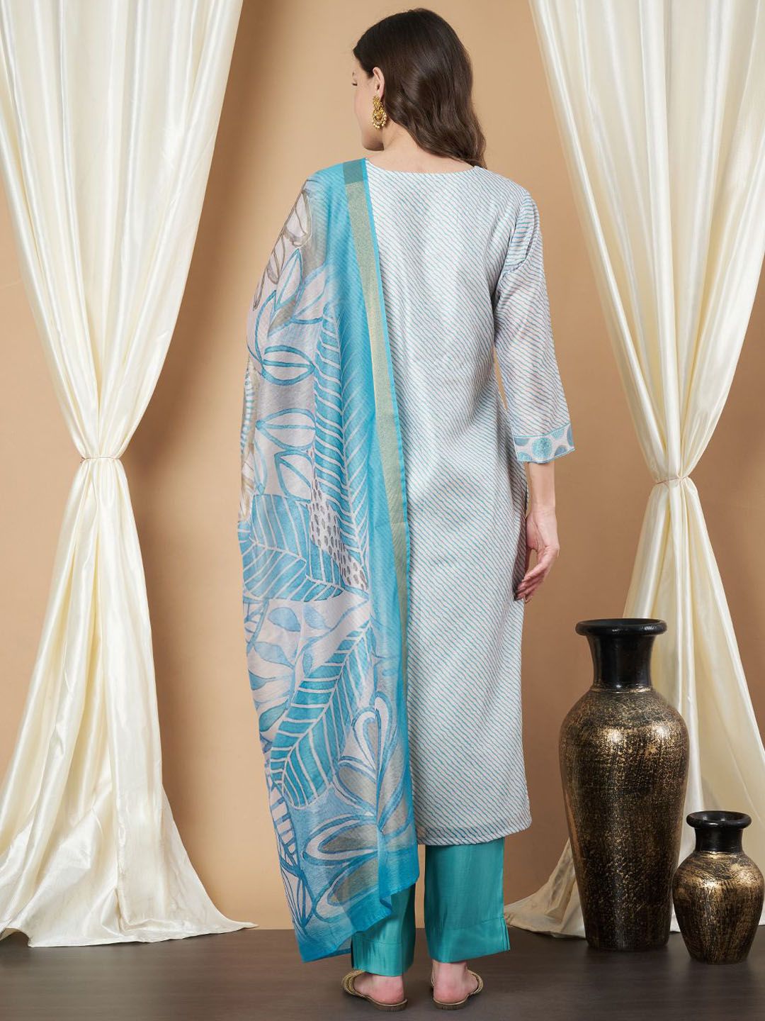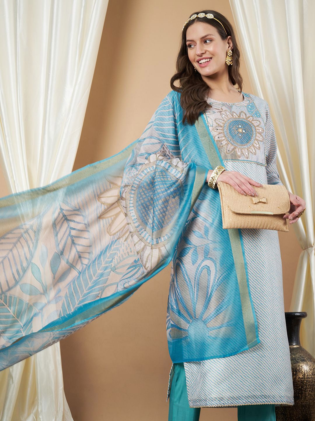 Label Khoj Women’s Firoji Chanderi Embroidered Kurta with Pant and Firoji Dupatta