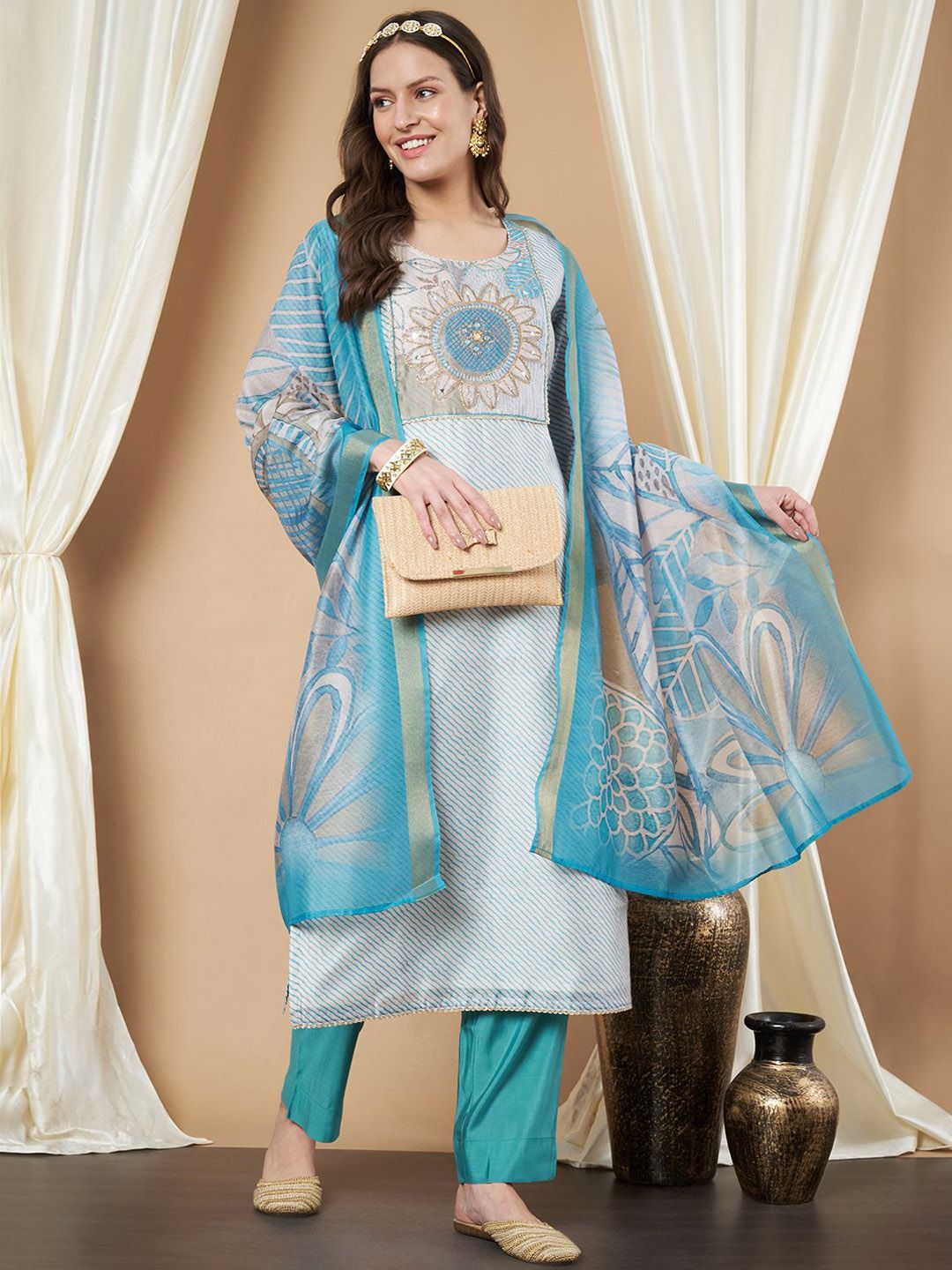 Sea green embroidered Kurta with Trousers with dupatta