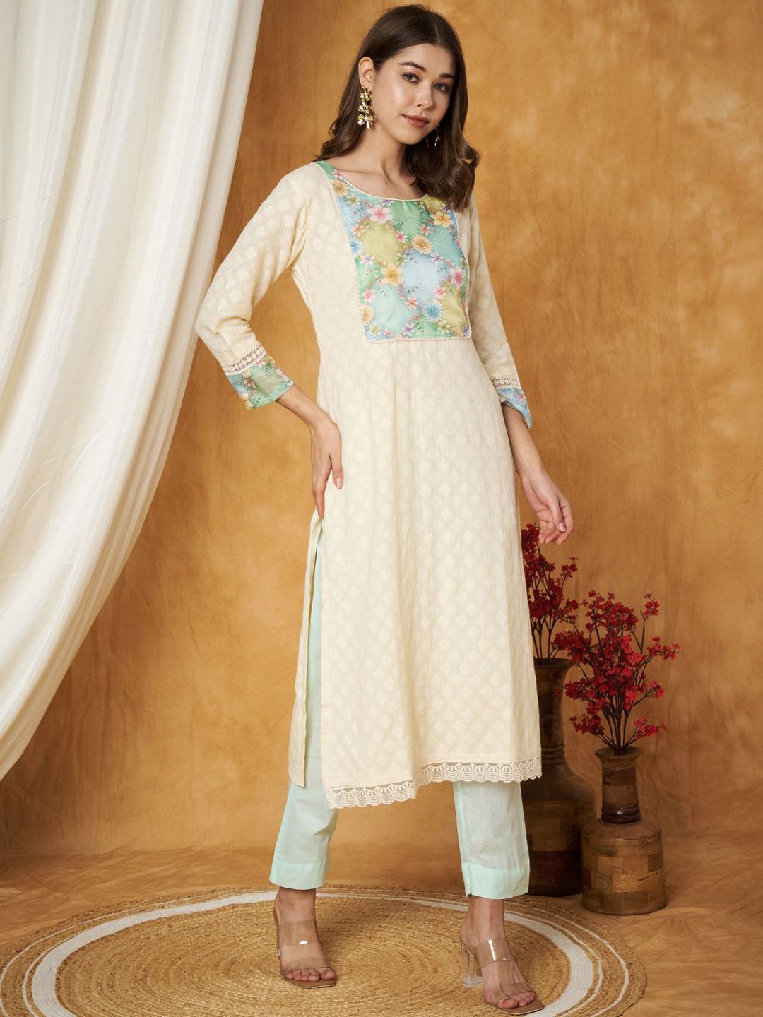 Beige, green, yellow printed kurta with trouser