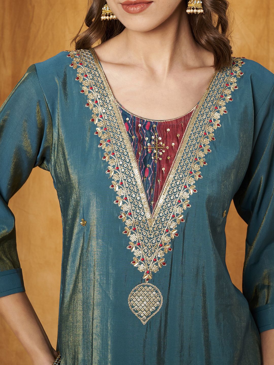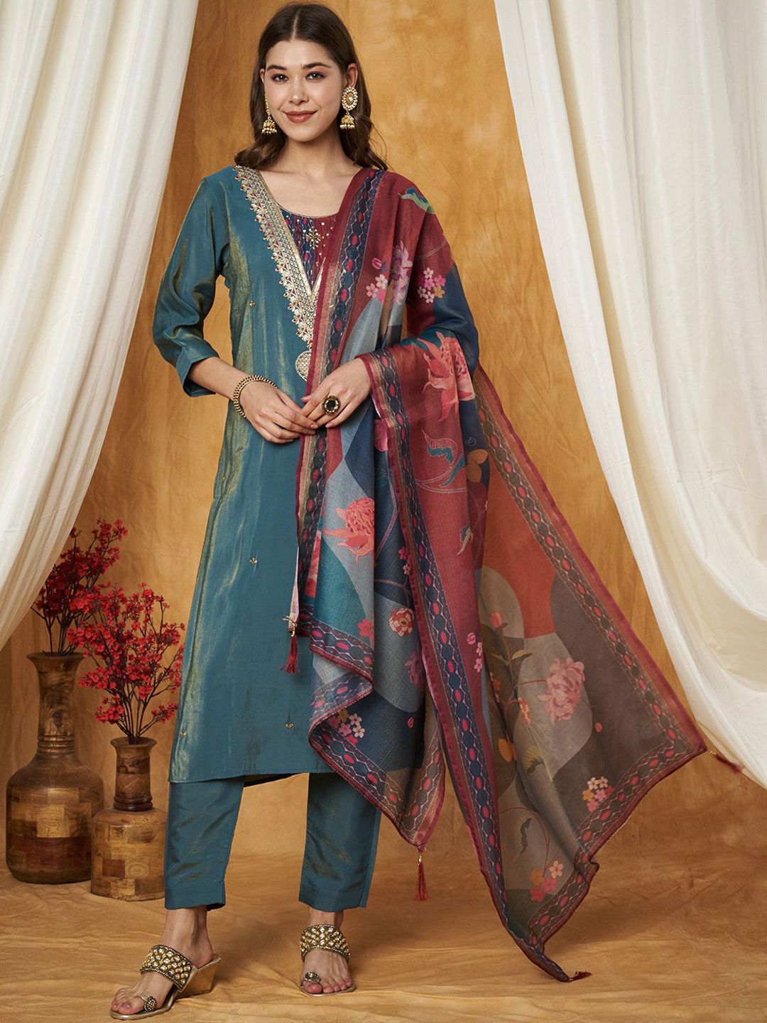 Grey, red, blue embroidered kurta with trouser and dupatta