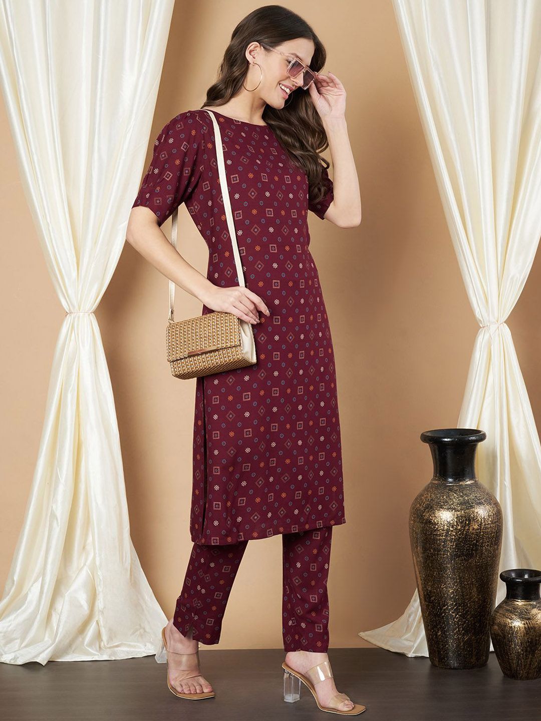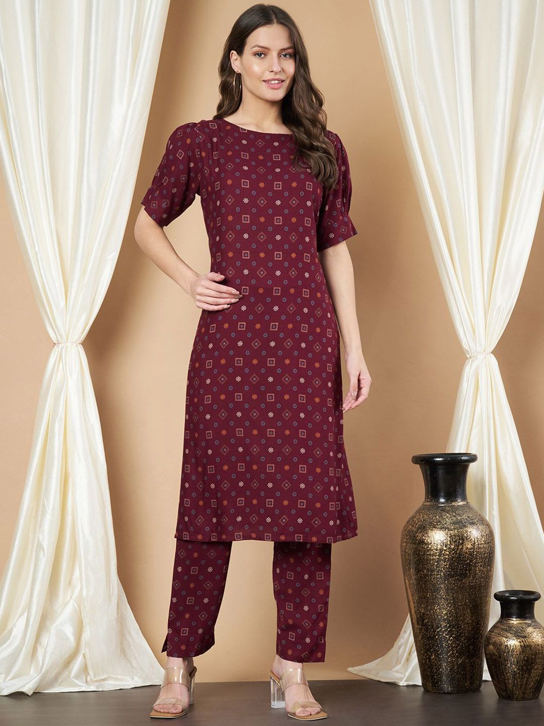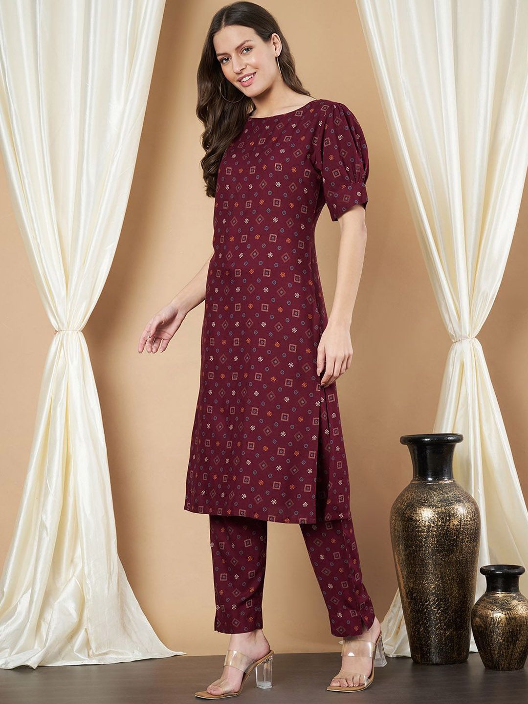 Maroon printed Kurta with Trousers