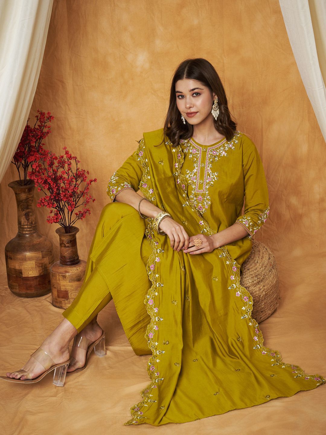 Label Khoj Women’s Parrot Silk Blend Embroidery Kurta with Pant and Dupatta
