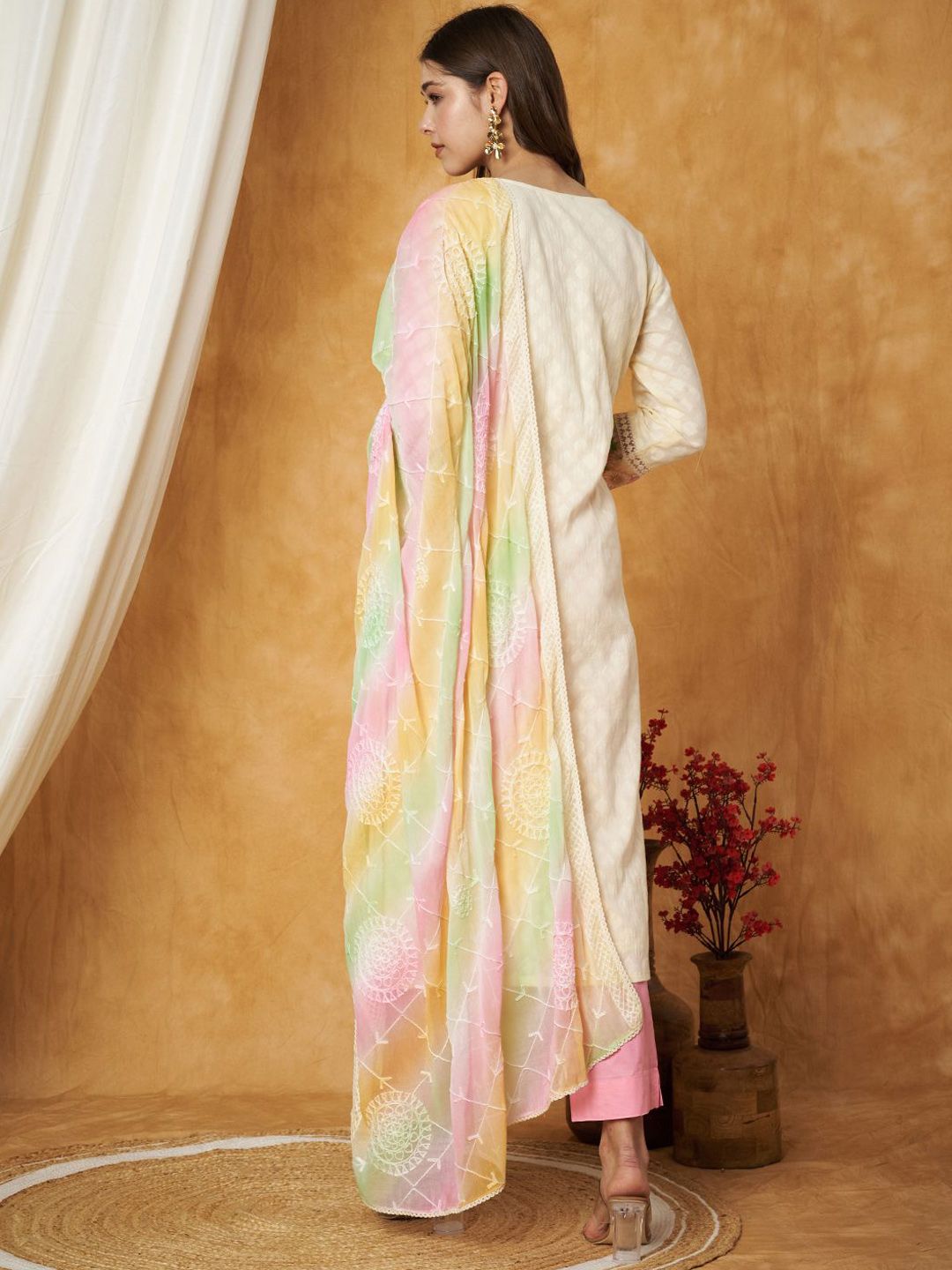 Beige, green, pink embroidered kurta with trouser and dupatta