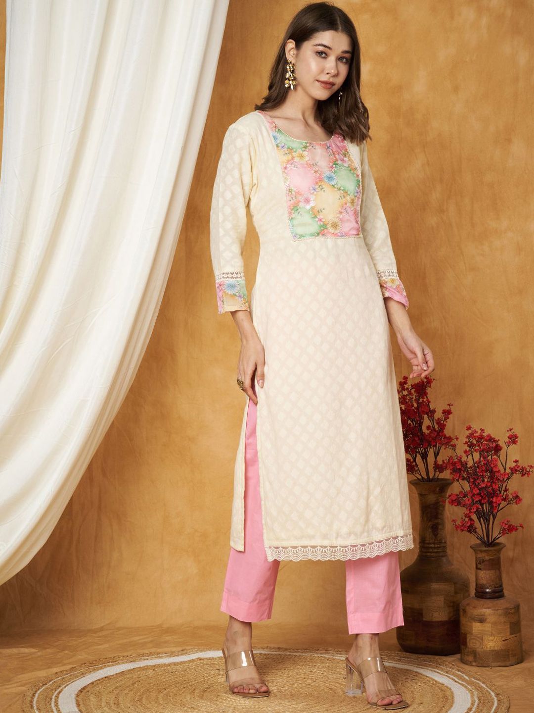 Label Khoj Women’s Pink Cotton Jacquard Patch Work Kurta with Pant and Dupatta