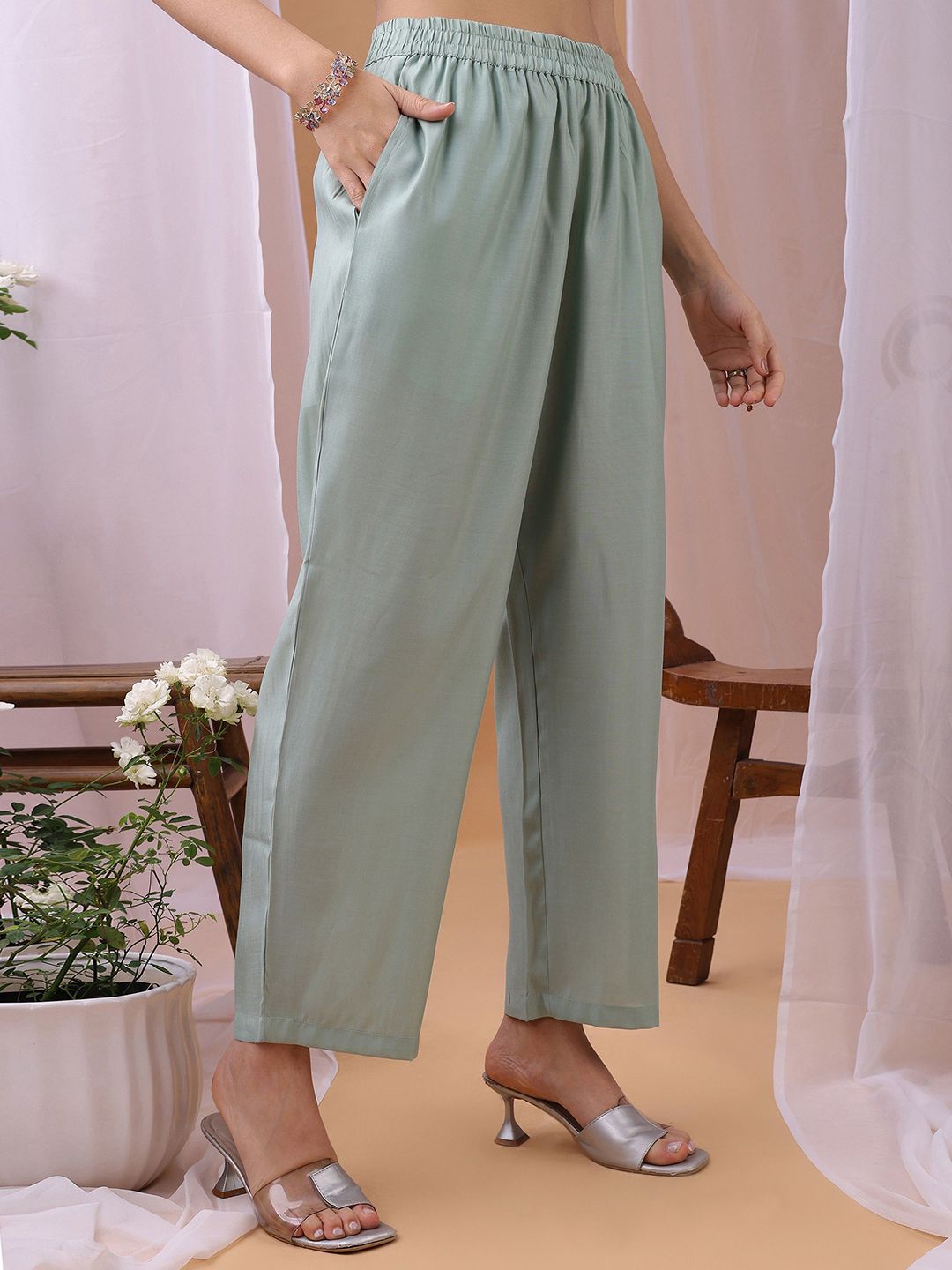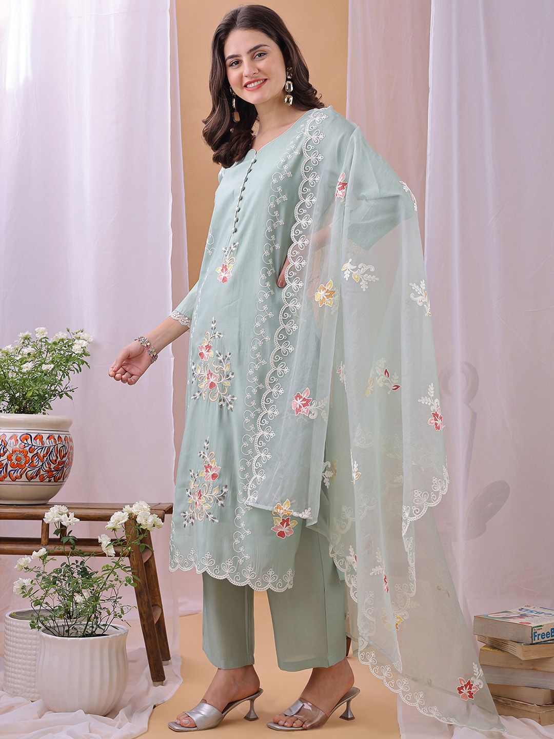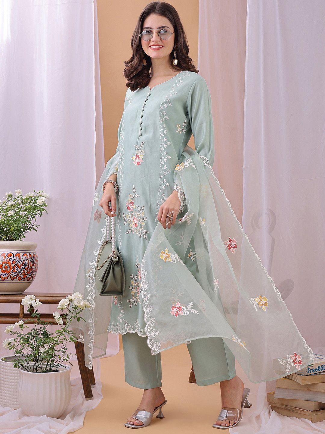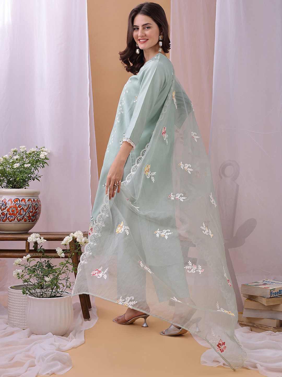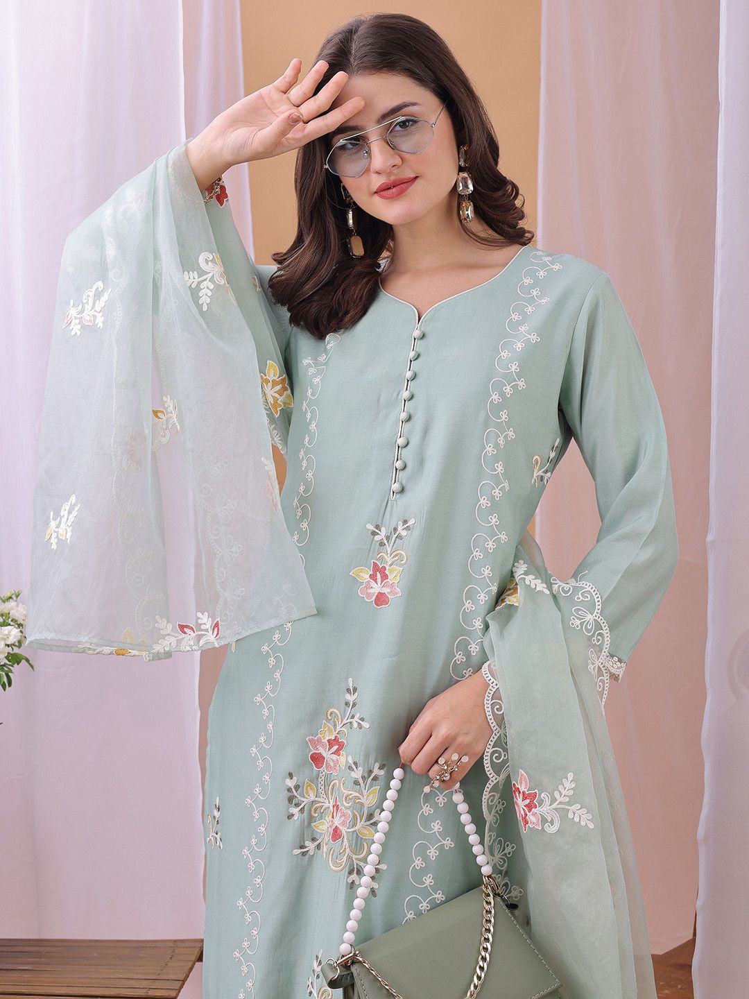 Label Khoj Women’s Pista Silk Blend Thread Work Kurta with Pant and Pista Dupatta