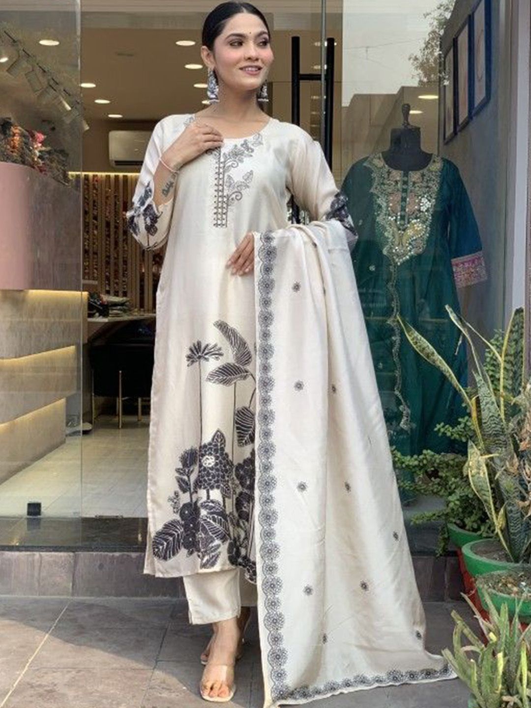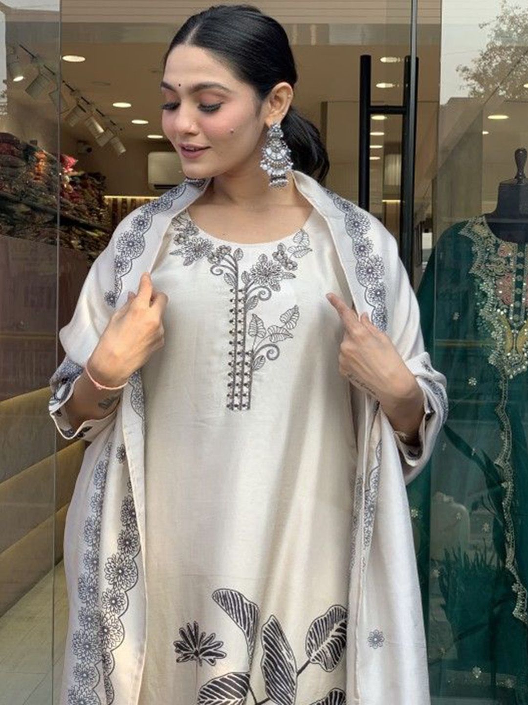 White and black printed Kurta with Trousers & dupatta