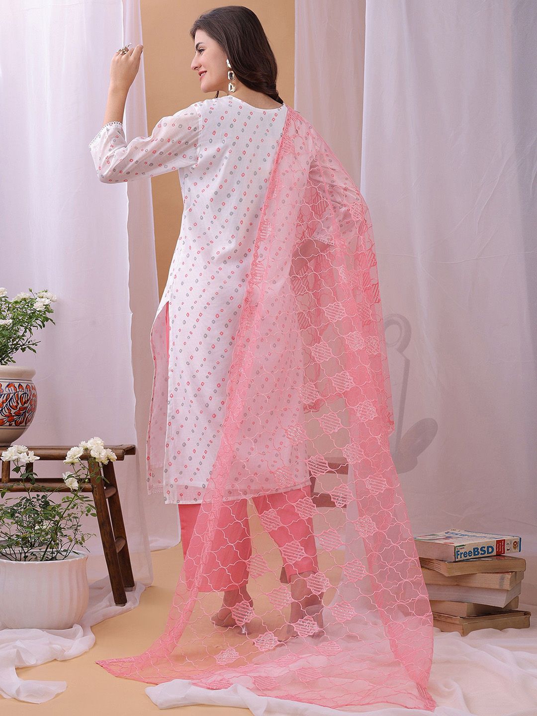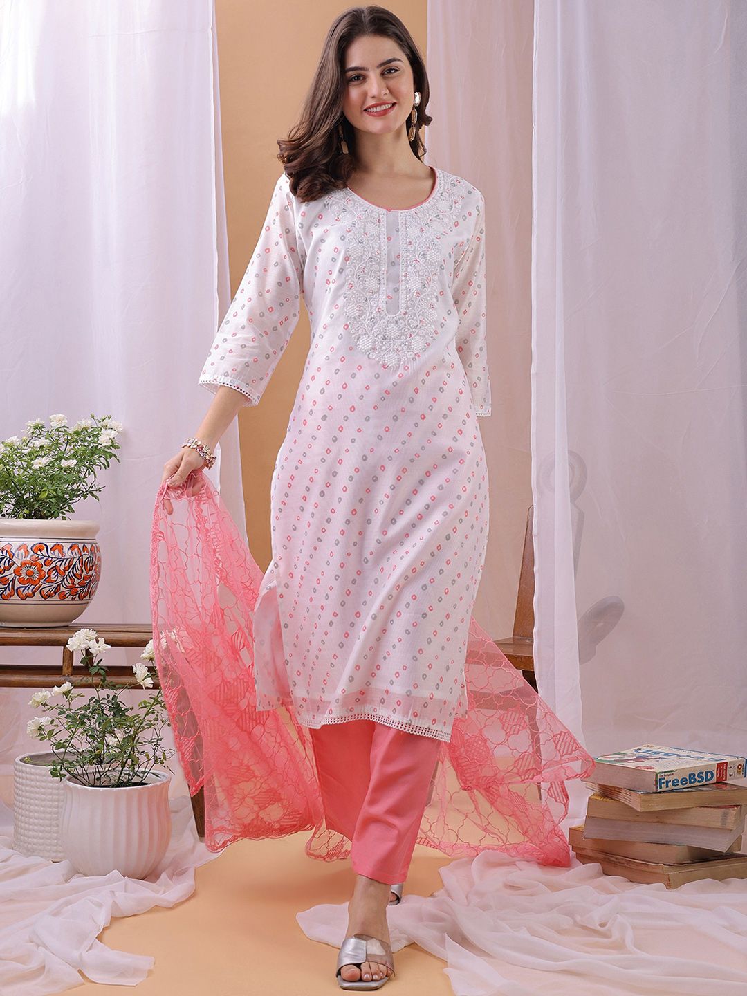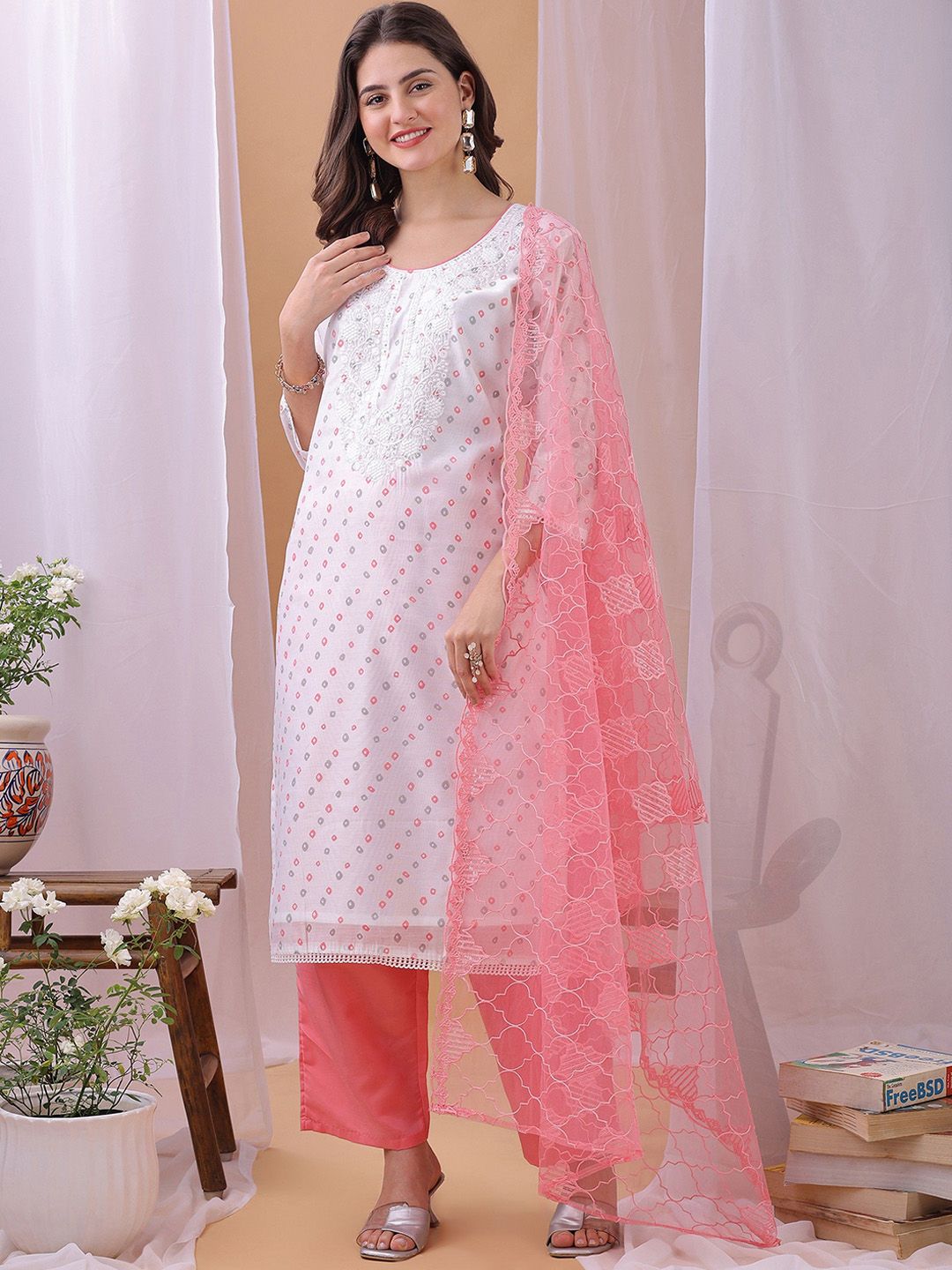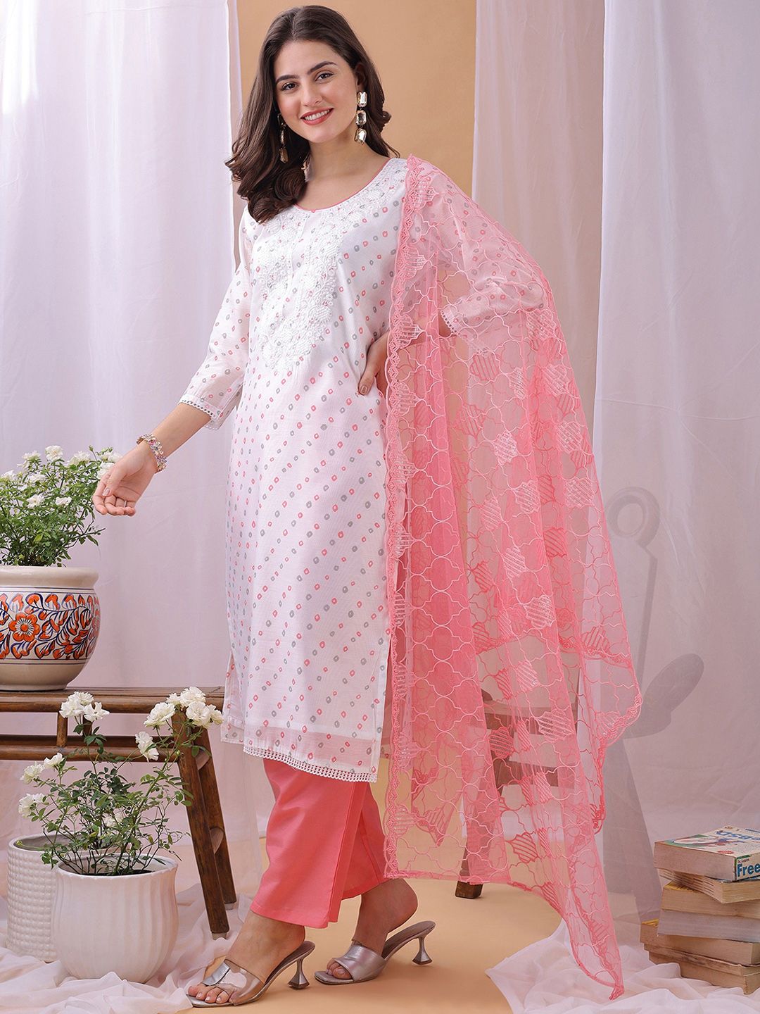 Label Khoj Women’s White & Pink Chanderi Embroidered Kurta with Pant and Pink Dupatta