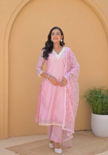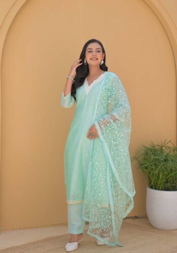 SKU: 9913Label Khoj Women Chanderi kurta, trouser and dupptta set