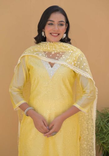 Label Khoj Women’s Mustard Chanderi Embroidered Kurta with Pant and Mustard Dupatta