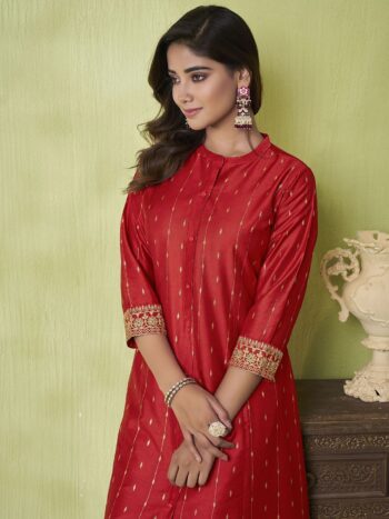 SKU: 10016ALabel Khoj Women Cotton Slub Embroidery , Foil Print Work Red Color Kurta & Bottom Set