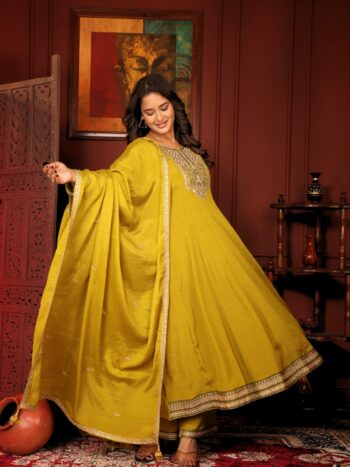 Label Khoj Women’s Mustard Chanderi Embroidered Kurta with Pant and Mustard Dupatta